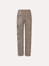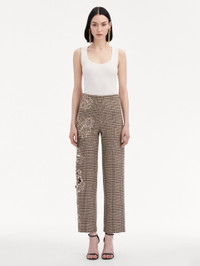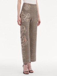 Crafted from virgin wool and finished with a Prince of Wales plaid print, these pants are defined by perfectly placed peony guipure appliques. With a straight leg cut and high waist, these pants are both a statement and a staple. Details - High Waisted - Banded Waist - Straight Leg Silhouette - Concealed Side Zipper - Unlined - Style Code: 24FE325WOH_COI Materials & Care - 100% Virgin Wool Embroidery; 100% Polyester
