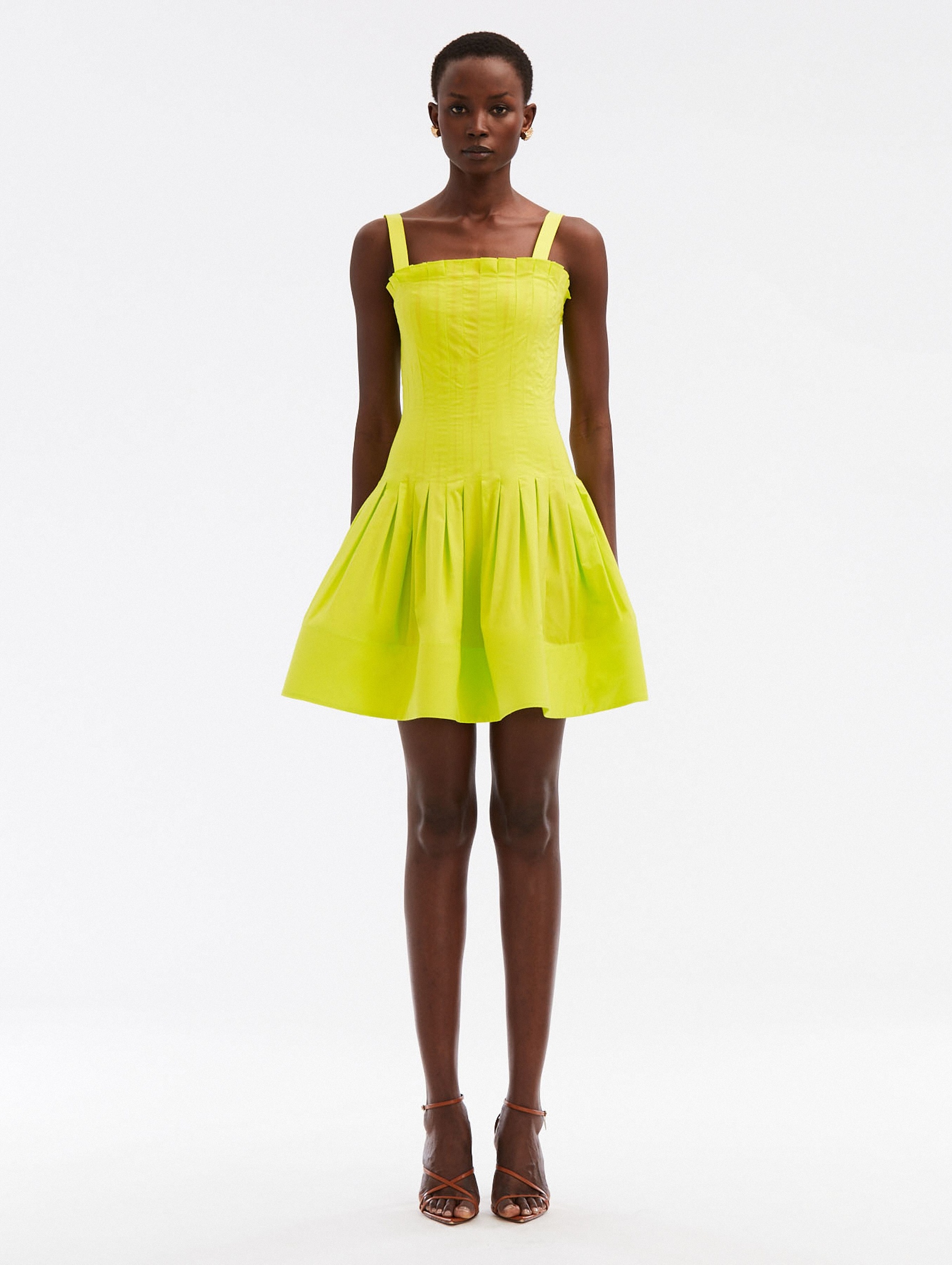 NEON YELLOW COTTON POPLIN IGNITES THE SILHOUETTE OF THIS DARING MINI DRESS. THIS PIECE IS DESIGNED WITH A PLEATED BODICE THAT GIVES WAY TO A STRUCTURED SKIRT. SLEEVELESS / SQUARE NECKLINE / FIT-AND-FARE SILHOUETTE / CONCEALED BACK ZIPPER / INTERNAL BUSTIER / DRY CLEAN DIMENSIONS: MODEL IS 5'10.5" / 180 CM AND WEARING SIZE 2 MATERIAL: 97% COTTON, 3% ELASTANE MADE IN ITALY STYLE 24SN611CPP_NYW