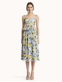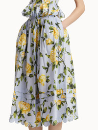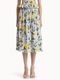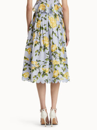 Elevated separates answer the call for modern dressing. English roses blossom in full upon this yellow midi skirt. Crafted from cotton poplin, this piece features delicate scallop detailing and pairs perfectly with its coordinating top. Details - High Waisted - Banded Waist - Below the Knee Length - Scallop Trim - Side Seam Pockets - Concealed Side Zipper - Unlined - Style Code: 25SN423RCN_YLB - Country of Origin: Italy Materials & Care - 97% Cotton, 3% Elastane; Trim: 100% Polyester