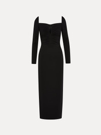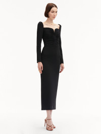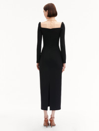 This classic black cocktail dress, crafted from stretch cady, features a plunging sweetheart neckline and long sleeves, blending elegance with modern allure. Details - Long Sleeves - Sweetheart Neckline - Tea Length - Center Back Slit - Concealed Back Zipper - Lined - Style Code: 25RN608SRY_BLK Materials & Care - 97% Viscose, 3% Elastane; Lining: 94% Silk, 6% Elastane