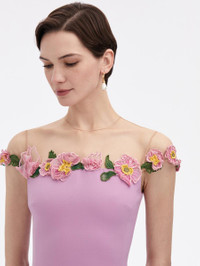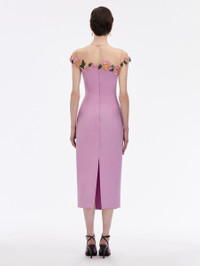 DEFINED BY EXQUISITE FLORAL THREADWORK EMBROIDERY THAT DELICATELY LAYS BELOW AN ILLUSION TULLE NECKLINE, THIS CURVE-HUGGING DRESS FEATURES CAP SLEEVES AND A CENTER BACK SLIT. CAP SLEEVES / ILLUSION NECKLINE / SLIM FIT / BELOW THE KNEE LENGTH / CENTER BACK SLIT / KEYHOLE BACK CLOSURE / DRY CLEAN DIMENSIONS: MODEL IS 5'10.5" / 180 CM AND WEARING SIZE 2 MATERIAL: 94% VIRGIN WOOL, 5% ELASTANE, 1% POLYAMIDE MADE IN USA STYLE 24SE6022DSW_LUP