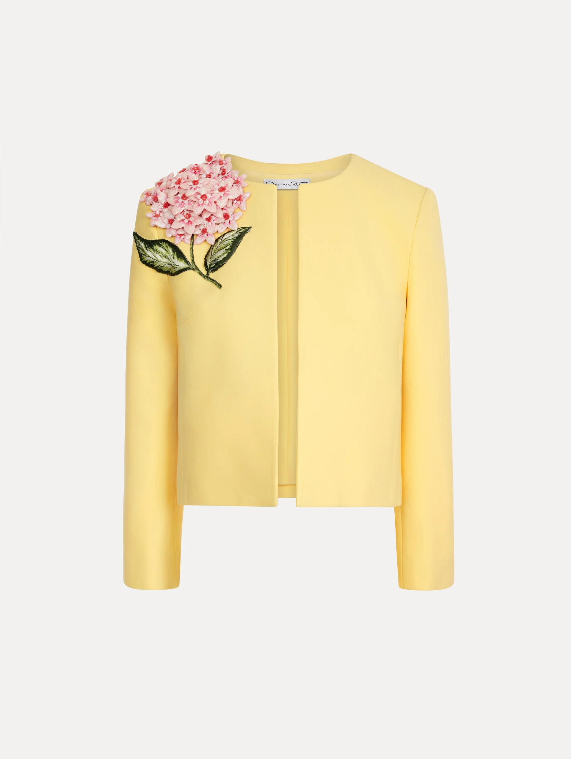 A refined counterpart to the embroidered dress, this cropped jacket is tailored from double-faced stretch wool and finished with sculptural porcelain flower embroidery at the shoulder. The clean, collarless silhouette enhances the artistry of the hand-applied detailing. Details - Long Sleeves - Shoulder Pads - Jewel Neckline - Open Front - Style Code: 26SE501DSW_BTR - Country of Origin: ITALY Materials & Care - 94% Cashmere, 5% Elastane, 1% Polyamide; Lining: 100% Silk - Spot clean only. - Do not dry clean, iron, steam, bleach, or wash.