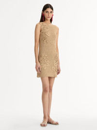 Tonal porcelain flowers bloom across an intricate hand-crocheted lattice, their sculpted petals winding organically along the body. The openwork stitch gives the silhouette a refined lightness while the raised floral motifs add soft dimension and artistry. Details - Sleeveless - Jewel Neckline - Slim Fit - Pullover Style - Style Code: 26SN175CPO_TNA - Country of Origin: USA Materials & Care - 100% Cotton - Dry clean only.