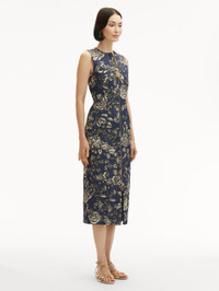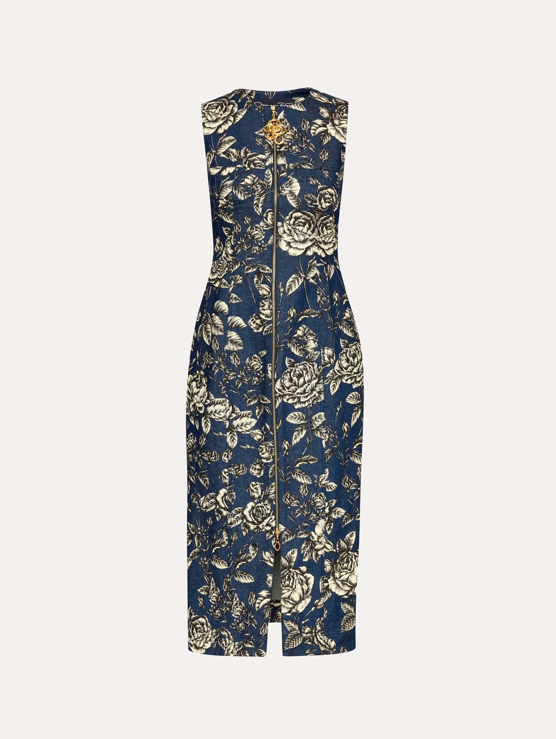 This denim midi dress features a rosette-printed design that evokes the depth and texture of the devore wash, an element seen throughout the collection. Designed with a zip-front, this dress offers a fresh, contemporary style. Details - Sleeveless - Jewel Neckline - Zip Front - Below the Knee Length - Slim Fit - Unlined - Style Code: 25SN255DNR_WTI - Country of Origin: Italy Materials & Care - 99% Cotton, 1% Elastane