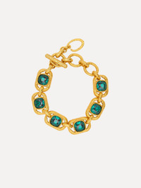This bracelet blends bold form with refined sparkle. Hammered gold-tone rectangular links offer a textured finish, while cushion-cut crystals at the center add a touch of brilliance. Details - Dimensions: 21 cm - Weight: 43 grams - Toggle Clasp / European Glass Crystals - Style Code: F25J702_EMR - Country of Origin: Italy Materials & Care - - 94% Brass, 6% Crystal Glass - - Avoid exposing your jewelry to harsh chemicals. - - Lotions, cosmetics, hairspray and perfumes can cause chemical reactions that can cause the finish to deteriorate. - - Before handling, washing hands after applying makeup and hair products will help to preserve the finish. - - Do not wear in the pool, on the beach or in the shower. - - Wipe away dirt and body oils with a slightly damp microfiber jewelry cloth or cotton ball and allow to dry. - - Store separately in cloth pouches or small boxes to minimize scratching.