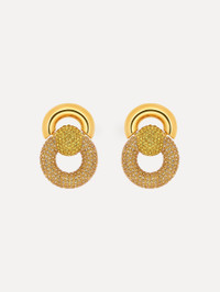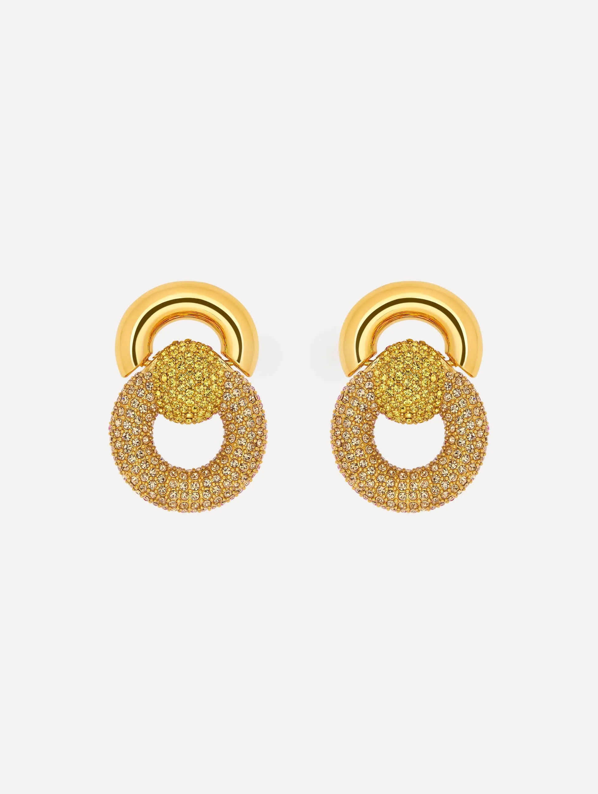 These sculptural drop earrings pair polished gold rings with pave-encrusted spheres. The bold, interlocked design brings a refined sense of structure and a striking shimmer to any look. Details - Dimensions: 29 mm x 27 mm - Weight: 23 grams - Clip Backs with Comfort Pads - European Glass Crystals - Style Code: F25J921_TOP - Country of Origin: Italy Materials & Care - - 97% Brass, 3% Crystal Glass - - Avoid exposing your jewelry to harsh chemicals. - - Lotions, cosmetics, hairspray and perfumes can cause chemical reactions that can cause the finish to deteriorate. - - Before handling, washing hands after applying makeup and hair products will help to preserve the finish. - - Do not wear in the pool, on the beach or in the shower. - - Wipe away dirt and body oils with a slightly damp microfiber jewelry cloth or cotton ball and allow to dry. - - Store separately in cloth pouches or small boxes to minimize scratching.