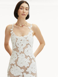 This bright white crochet knit dress is a stunning interpretation of this season's hero flora, the English rose. Crafted with intricate floral detailing, it features a sleeveless silhouette and scoop neckline, combining timeless elegance with modern femininity. Details - Sleeveless - Scoop Neckline - Below the Knee Length - Slim Fit - Pullover Style - Lined - Style Code: 25SN199RSM_WHT - Country of Origin: USA Materials & Care - 100% Cotton