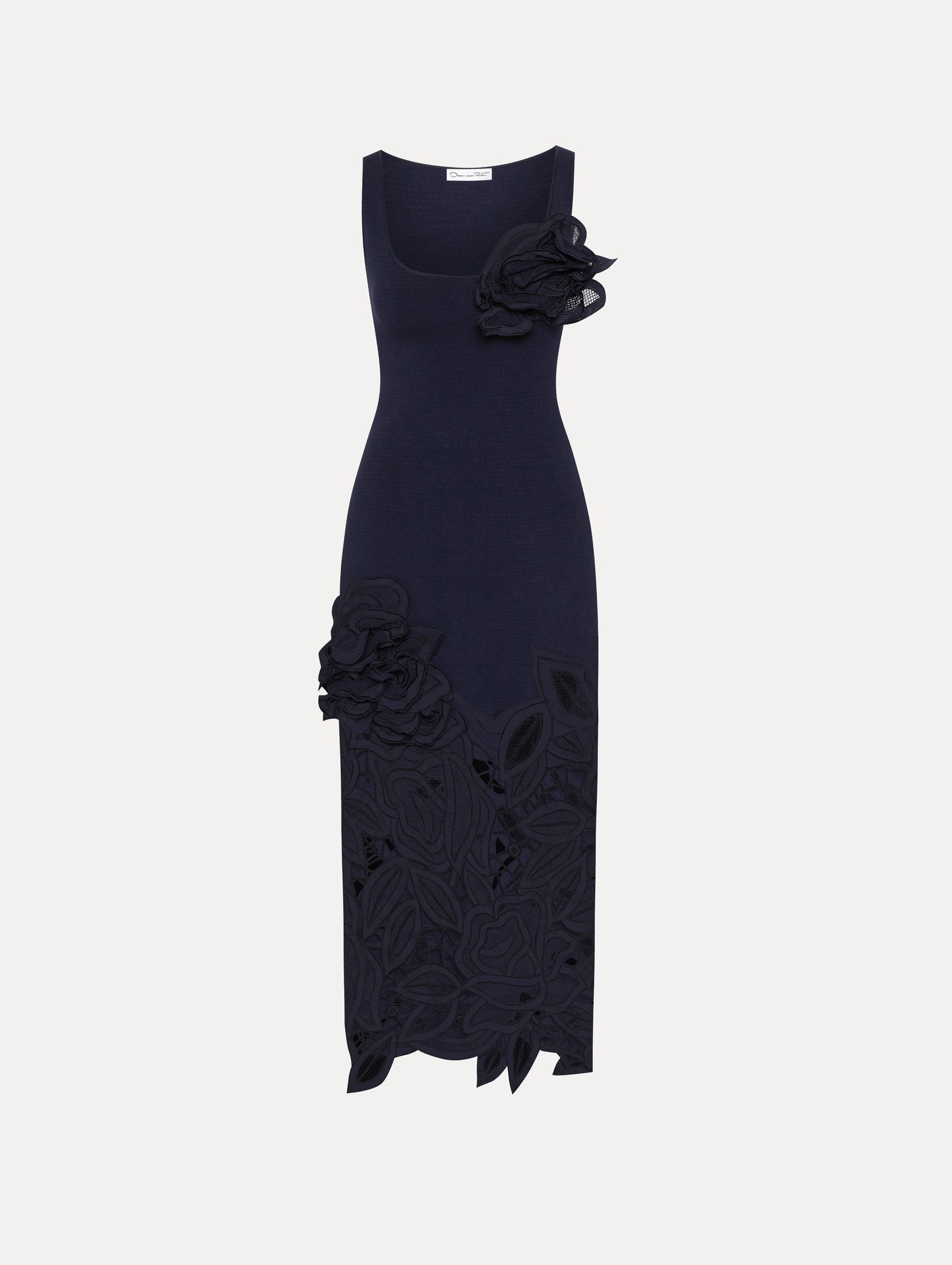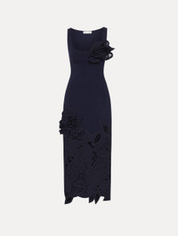This knit dress offers a new iteration of this season's painterly English Rose motif. Climbing florals are realized as guipure lace cutouts on the skirt. In contrast, the knit bodice provides a sleek fit, creating a harmonious balance between texture and design. Details - Sleeveless - Scoop Neckline - Below the Knee Length - Slim Fit - Concealed Side Zipper - Unlined - Style Code: 25SE150HUG_NAV - Country of Origin: Italy Materials & Care - 66% Viscose, 28% Polyester, 4% Polyamide, 2% Elastane