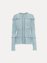 This long-sleeve cardigan is defined by its airy open-knit construction, scalloped trim, and soft textural patterning. Tiered ruffles lend dimension and movement, while a slender bow tie at the neckline completes the design with a touch of feminine refinement. Details - Long Sleeves - Crew Neckline - Open Front - Self-Tie Closure - Scallop Trim - Unlined - Country of Origin: Italy - Style Code: 26RN159MIX_SKY Materials & Care - 55% Silk, 45% Cotton - Dry clean only.
