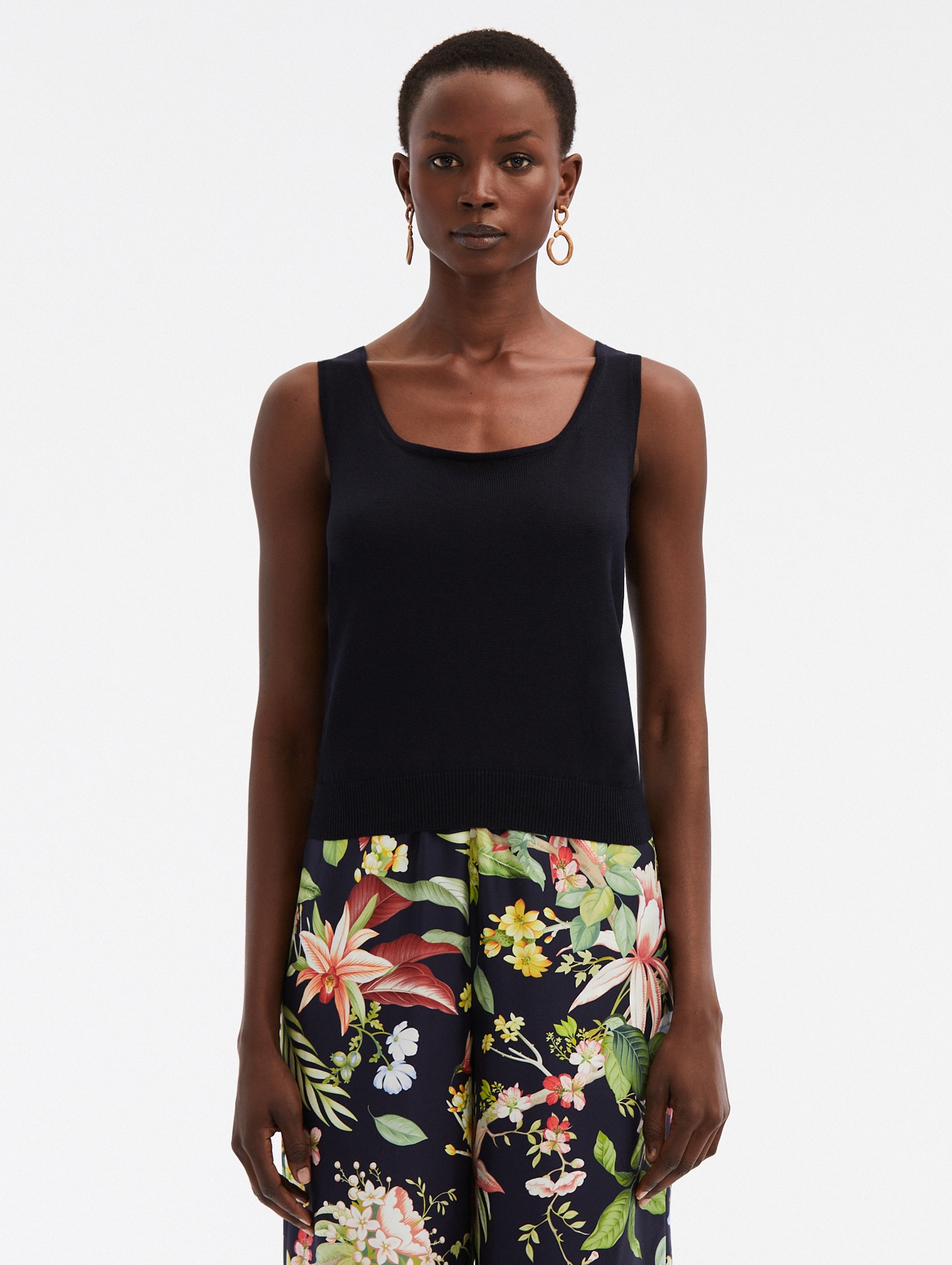 MAKE THIS TIMELESS TANK YOUR NEW GO-TO LAYERING PIECE. THIS SLEEVELESS STYLE IS DESIGNED IN A TIMELESS SHADE OF NAVY AND FEATURES A SCOOP NECKLINE FOR THE MOST FLATTERING FIT. SLEEVELESS / SCOOP NECKLINE / SLIM FIT / HIP LENGTH / PULLOVER STYLE / RIBBED TRIM / UNLINED / DRY CLEAN DIMENSIONS: MODEL IS 5'10.5" / 180 CM AND WEARING SIZE S MATERIAL: 55% SILK, 45% VISCOSE MADE IN ITALY STYLE 24SN158FFD_NVM