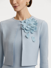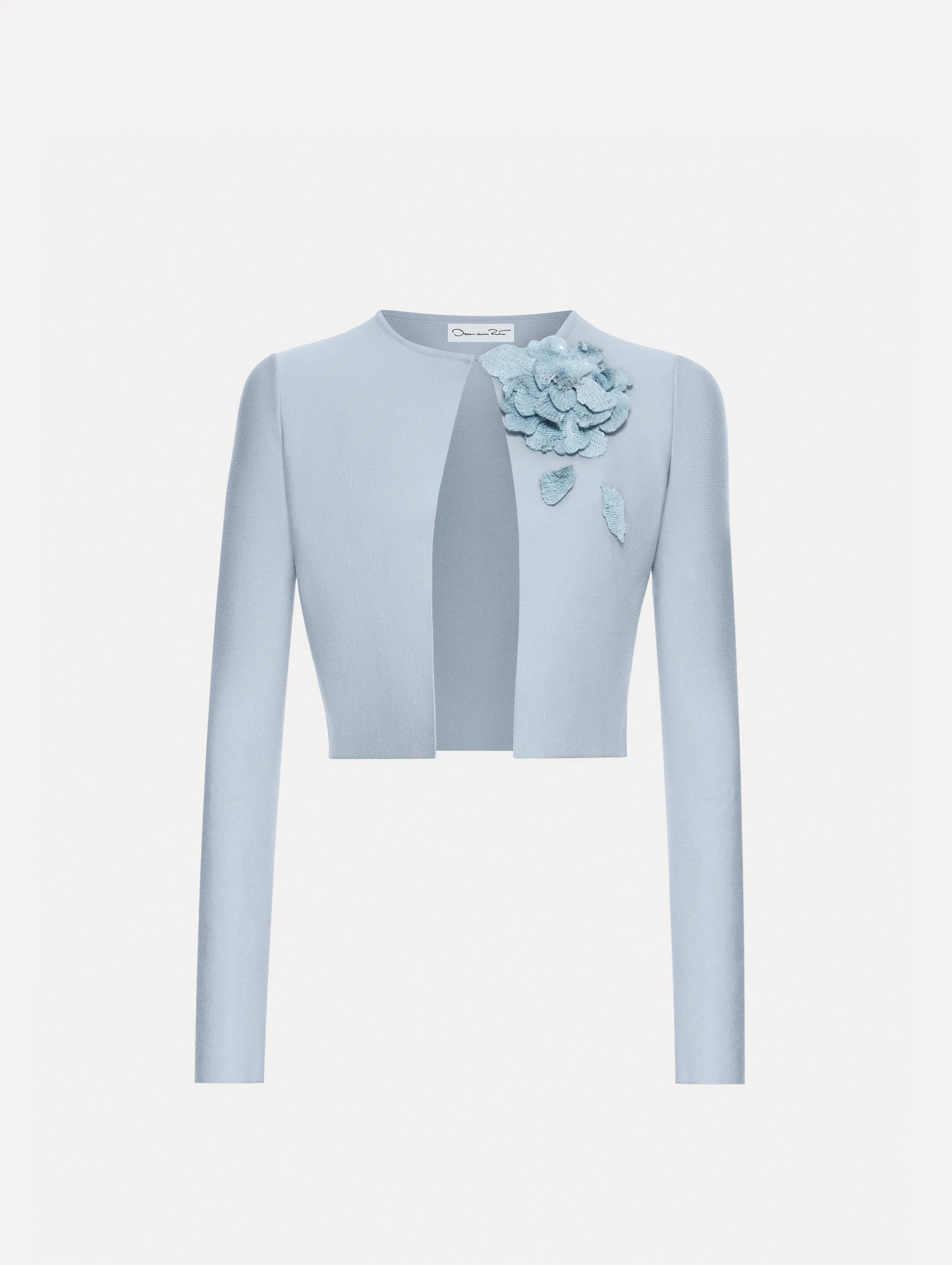 This overlayer is crafted in a soft shade of blue and cut in a cropped silhouette. Sequin peony appliques bloom at the neckline, adding subtle shimmer and a touch of romance to this timeless design. Details - Long Sleeves - Jewel Neckline - Open Front with Hook-and-Eye Closure - Cropped Silhouette - Unlined - Style Code: 25FE180RNG_LTB - Country of Origin: Italy Materials & Care - - 70% Viscose, 30% Polyester - - Spot clean only. - - Do not dry clean, iron, steam, bleach, or wash.