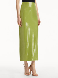 A new fabrication for the house, light-reflecting sequin jersey defines this pencil skirt. Its streamlined silhouette hugs the body with precision and its subtle shimmer adds an ethereal glow. Pair with its coordinating blouse. Details - High Waisted - Concealed Back Zipper - Center Back Slit - Lined - Style Code: 25PN407SQJ_FRN - Country of Origin: Italy Materials & Care - 70% Viscose, 30% Polyester; Lining: 85% Silk, 15% Elastane