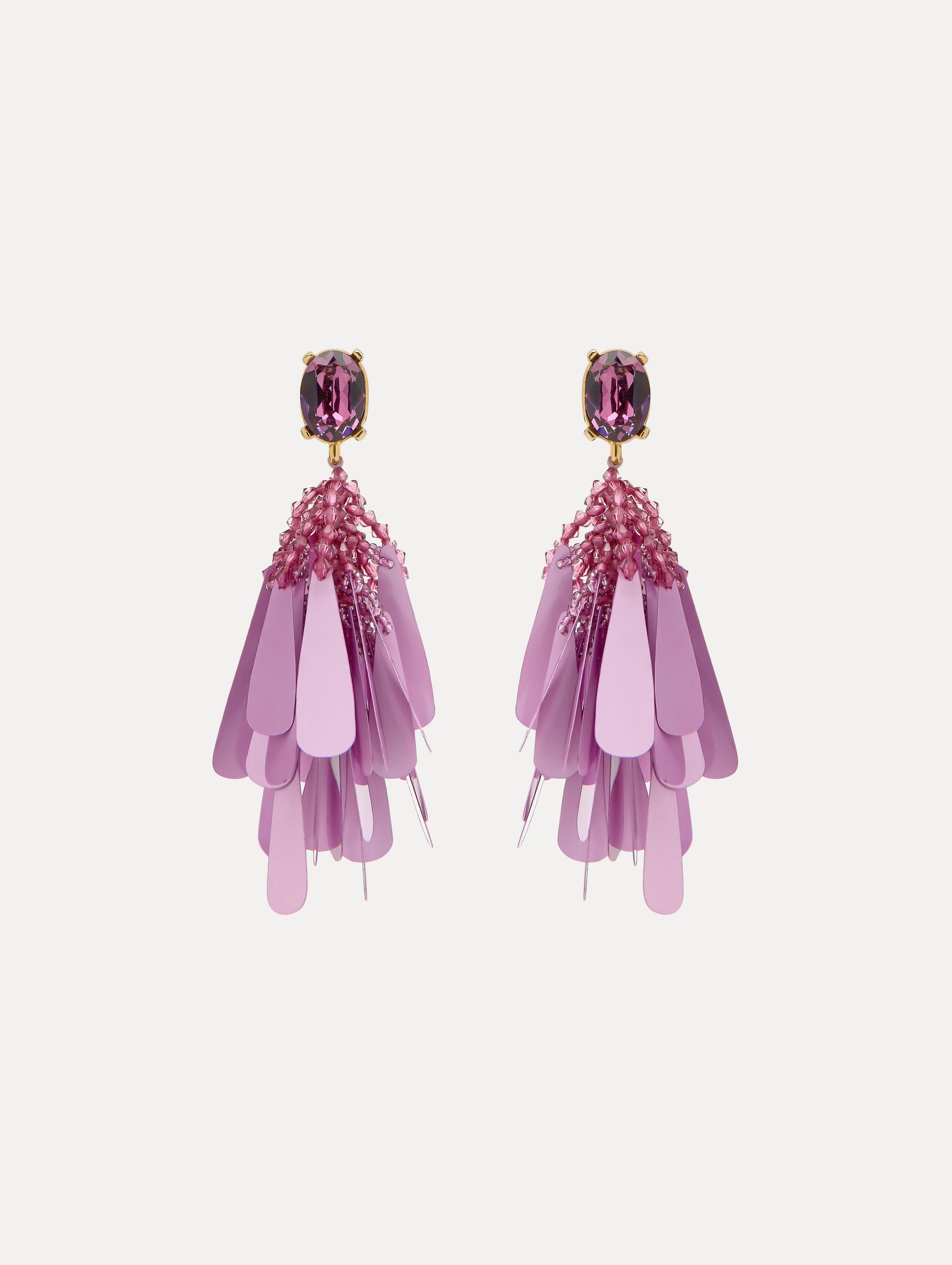 A cluster of glossy sequin petals is artfully suspended from a tonal glass crystal, creating a dynamic interplay of light and texture. Each element combines to subtly evoke the enchanting beauty of a blooming flower. Details - Dimensions: 9 cm x 3 cm - Weight: 8 grams - Clip Backs with Comfort Pads - Style Code: S25J183_VIO - Country of Origin: India Materials & Care - 50% Acrylic, 10% Resin, 10% Glass, 10% Polyester, 15% Brass