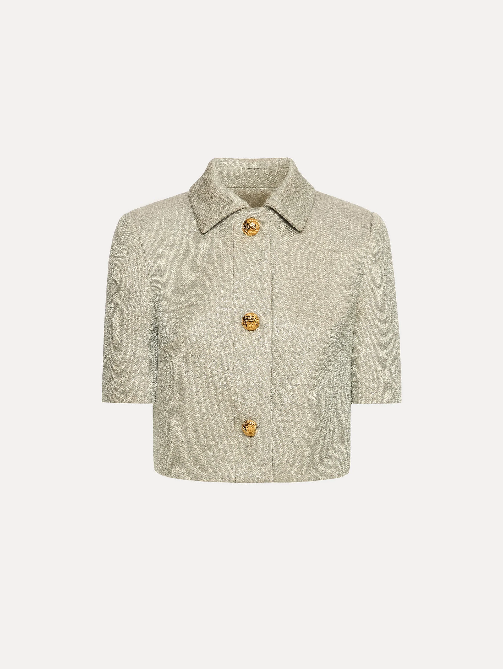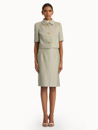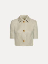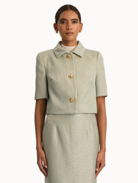 Woven with sequins for a subtle shine, this wool-blend tweed jacket offers a fresh take on classic tailoring. Short sleeves and gold-tone artichoke buttons—a signature motif of the collection—lend a refined yet whimsical touch. Details - Short Sleeves - Spread Collar - Button Front - Cropped Silhouette - 100% Silk Lining - Style Code: 25PN516SED_PEW - Country of Origin: Italy Materials & Care - - 55% Wool, 45% Polyamide; Lining: 100% Silk - - Spot clean only. - - Do not dry clean, iron, steam, bleach, or wash.