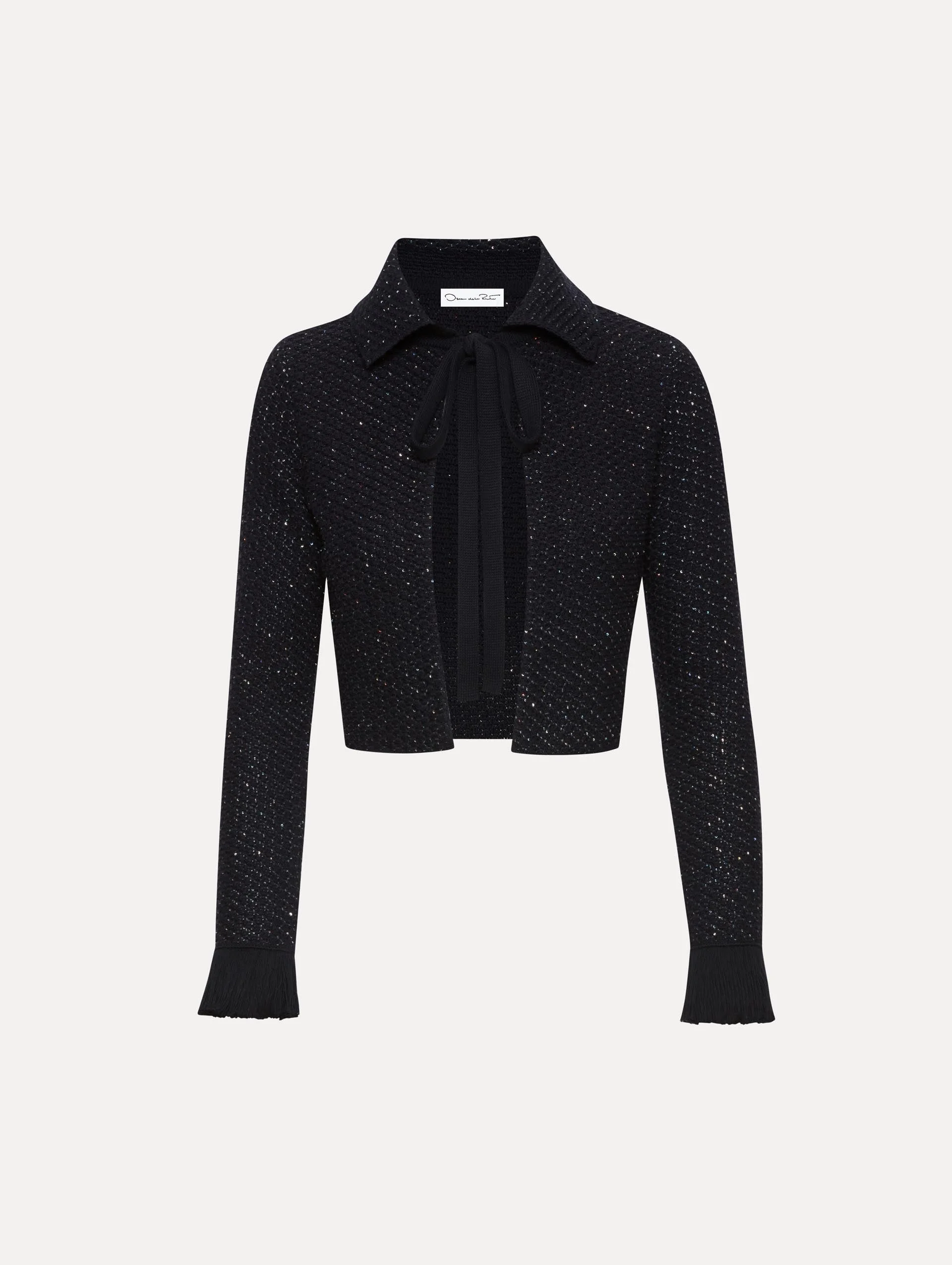 AN ESSENTIAL LAYERING PIECE IN ANY WOMAN'S WARDROBE, THIS JACKET IS TAILORED FROM A SEQUIN EMBOLDENED TWEED IN A DEEP SHADE OF NAVY. WITH LONG SLEEVES AND A SELF-TIE NECK, THIS PIECE IS BOTH A STATEMENT AND A STAPLE. LONG SLEEVES / SHIRT COLLAR WITH SELF-TIE CLOSURE / OPEN FRONT / CROPPED SILHOUETTE / FRINGE TRIM / UNLINED / DRY CLEAN DIMENSIONS: MODEL IS 5'10.5" / 180 CM AND WEARING SIZE XS MATERIAL: 91% COTTON, 9% POLYAMIDE MADE IN ITALY STYLE 24PN193TWE_NAV