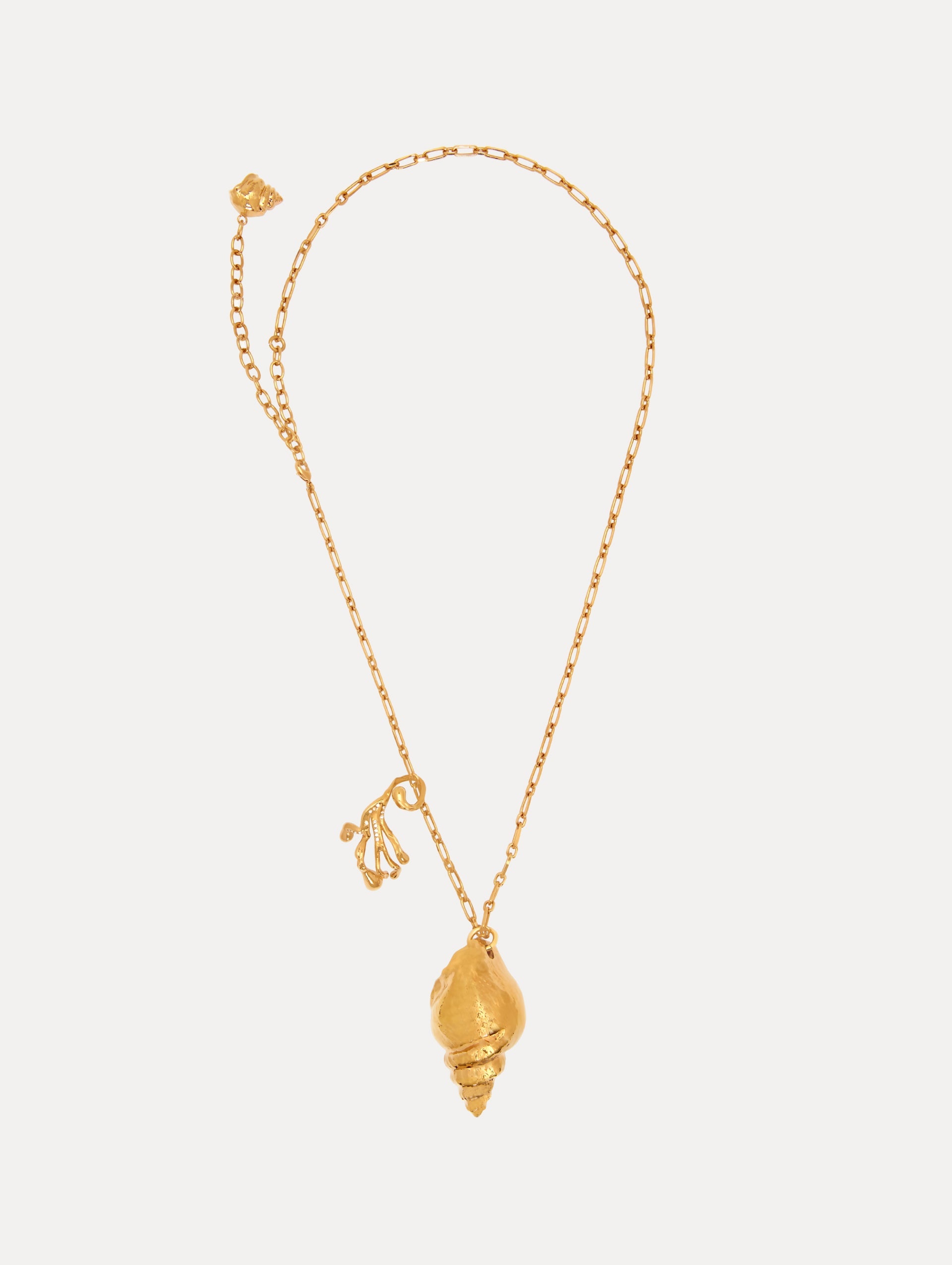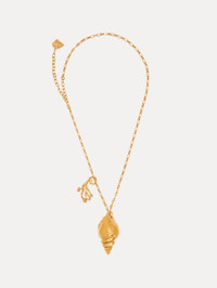 Featuring a single sea shell pendant and coral charm, this necklace evokes the beauty of the sea. Richly textured, this design captures the natural curves and details of a shell, while the gleaming gold finish adds the feeling grandeur. Details - Dimensions: 88 cm x 3.5 cm x 7 cm - Weight: 50 grams - 4" Extender Chain - Lobster Clasp - European Crystal Glass - Style Code: R25J811_GOL Materials & Care - 15% Aluminum, 85% Brass
