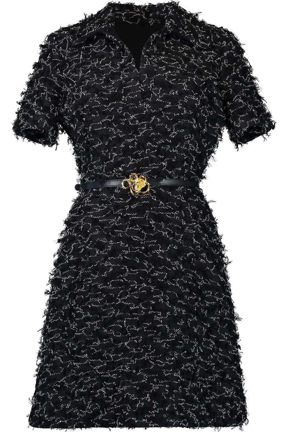 DETAILS AND INSIGHT Oscar De La Renta short sleeve eyelash belt dress in dark navy. 29CO;28PL;18VI;9COBIO;9PA GRS;4PLGRS;3PA Removable Belt Dry Clean Only Made In Italy Style 25SN2052ETW-DKN
