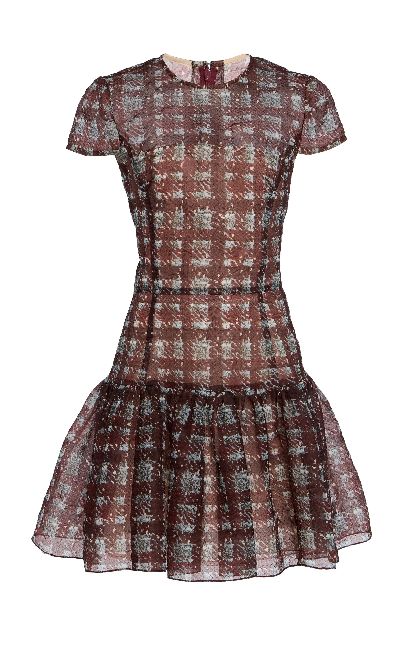 PRODUCT DETAILS - Short sleeve, drop waist, textured plaid, mini hem - Concealed zip fastening - Composition: 67% Silk, 33% Polyamide - Color: Burgundy/Blue - Dry clean only - Fall/Winter '25