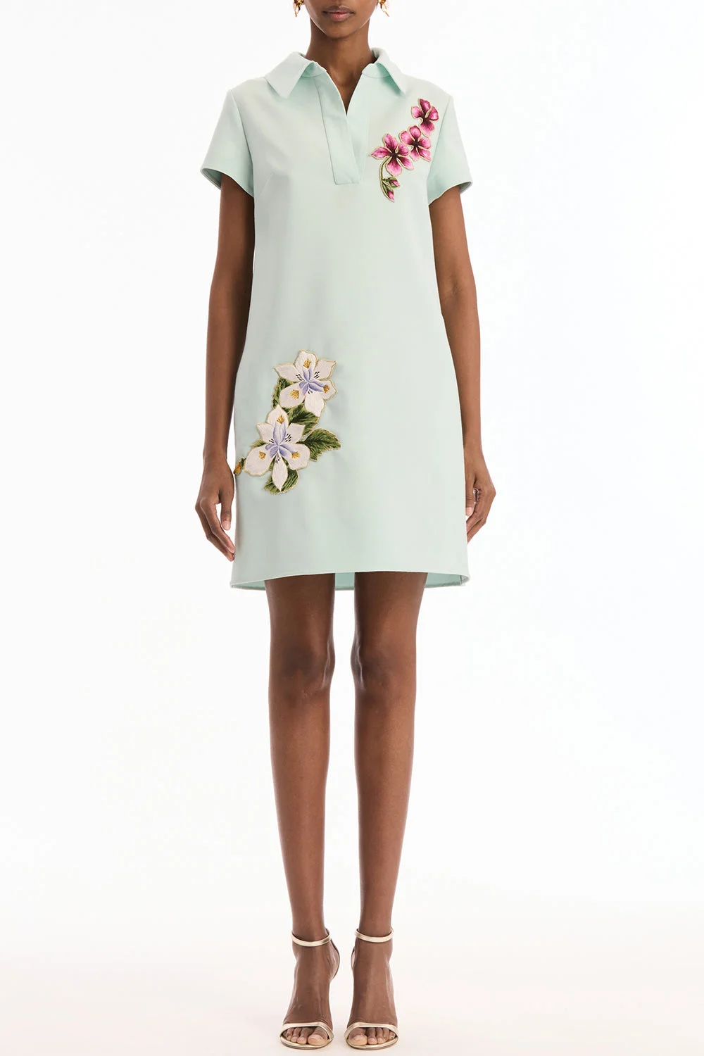 DETAILS AND INSIGHT Oscar De La Renta short sleeve embroidered collared day dress in saltwater. Pre-Order Ships By Aug 7 Wool Dry Clean Made In Italy Style 26PE255DSW-BLUE