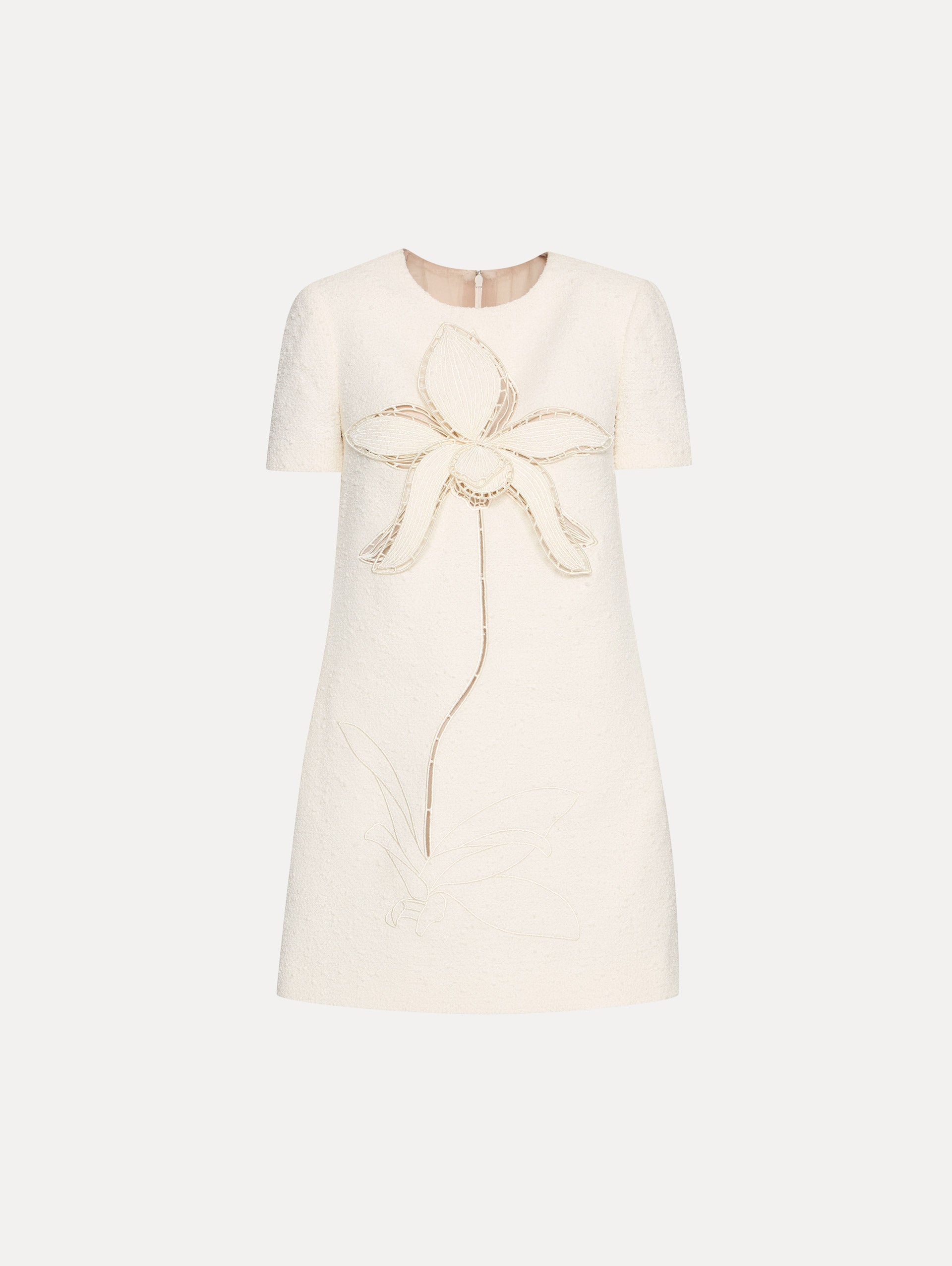 A charming solution for everyday dressing, this mini dress is enhanced by a perfectly placed orchid threadwork applique, adding dimension and detail. Cut in Oscar de la Renta's signature shift silhouette, this dress is finished with short sleeves and side seam pockets. Details - Short Sleeves - Jewel Neckline - Shift Silhouette - Mid-Thigh Length - Concealed Back Zipper - Side Seam Pockets - 100% Silk Lining - Style Code: 25RE207CWD_IVR Materials & Care - 64% Cotton, 27% Virgin Wool, 9% Polyamide; Lining: 100% Silk