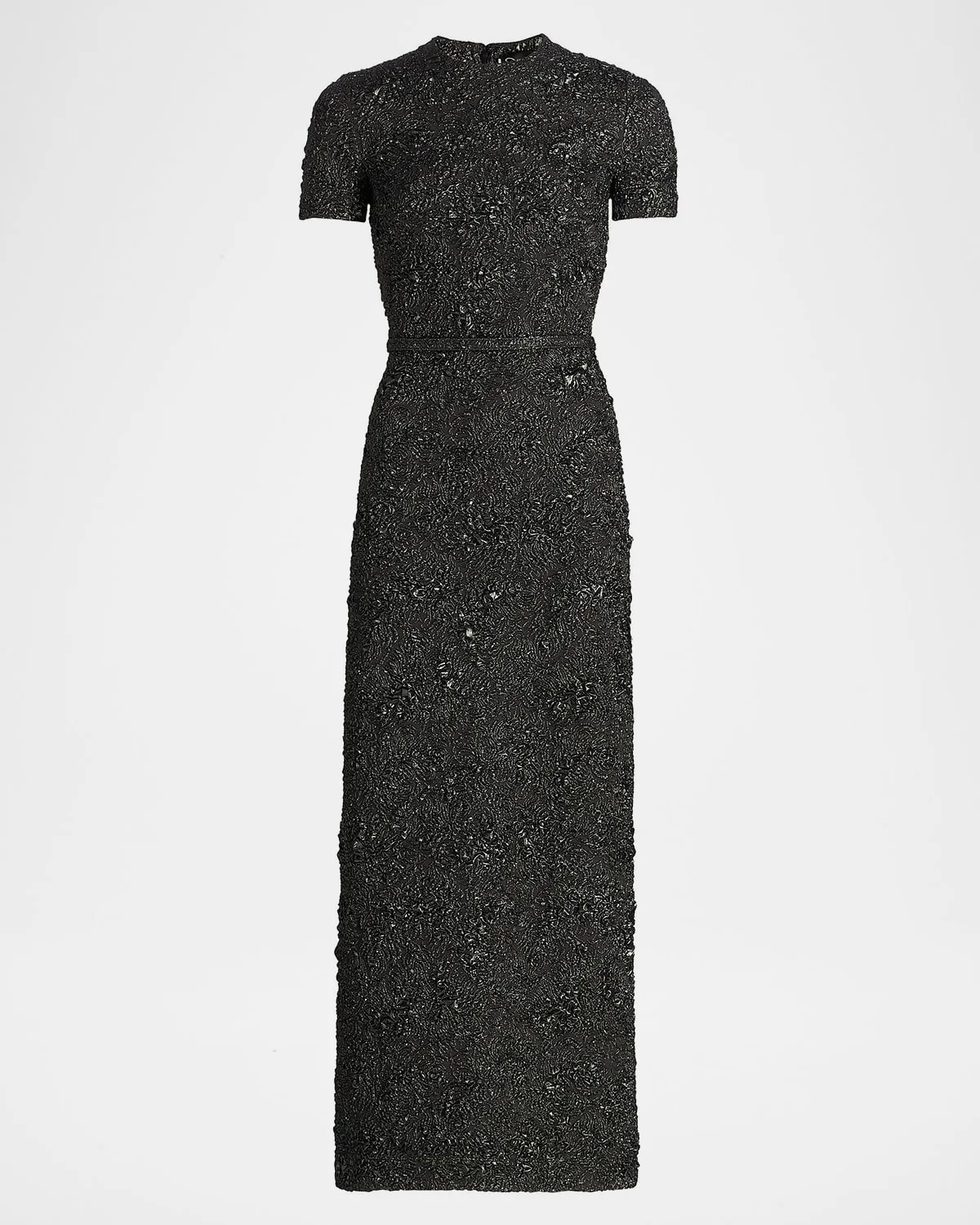Short-Sleeve Metallic Feather Jacquard Maxi Dress
