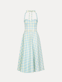 A pale blue and ivory gingham lends fresh refinement to this wool-blend halter dress. Defined by a structured bodice, flared midi skirt, and covered belt at the waist, the silhouette balances playful nostalgia with polished femininity. Details - Sleeveless - Halter Neckline - Bustier Bodice - Concealed Back Zipper - Style Code: 26SN246LGC_IEW - Country of Origin: ITALY Materials & Care - 96% Viscose Wool, 3% Elastane, 1% Polyamide; Lining: 100% Silk - Dry clean only.