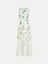 This dress captivates with an ombre fade from soft blue to white, with printed cherry blossoms that climb the silhouette in a poetic display of nature’s beauty. The design boasts a paneled construction which falls to a skirt of contrasting silk chiffon pleats that swish with every step. Details - Sleeveless - Jewel Neckline - Concealed Back Zipper - Unlined - Style Code: 25PN284CFD_WBO - Country of Origin: Italy Materials & Care - 92% Polyester, 8% Elastane