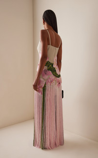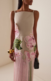 PRODUCT DETAILS - Sleeveless, embroidered, long fringed trim, maxi hem - Concealed zip fastening - Lined - Composition: Emb Base/Self: 100% Silk; Lining: 100% Polyester - Color: Pewter - Dry clean only - Pre-Fall '25