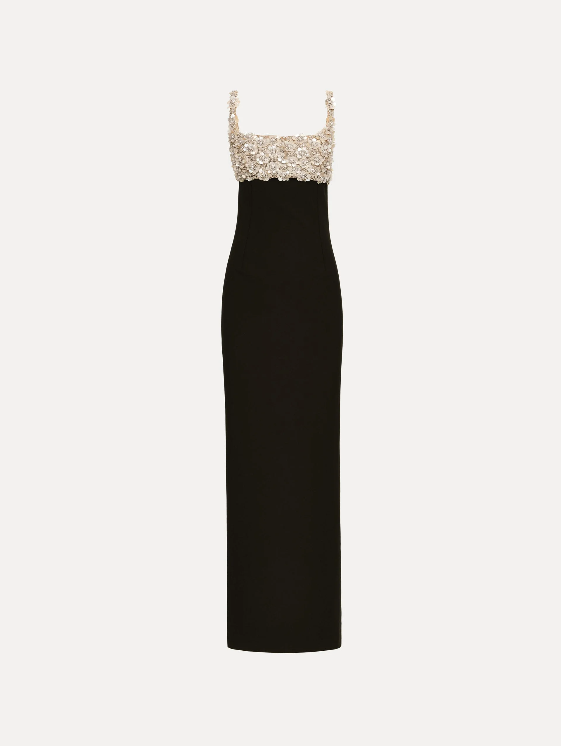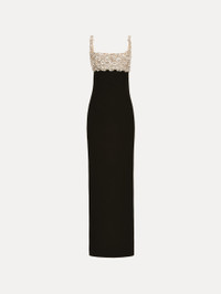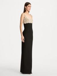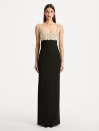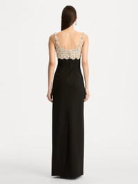 This gown contrasts a sleek column silhouette with a hand-embroidered bustier of mother-of-pearl and crystals. Each luminous blossom is artfully placed, bringing sculptural dimension and refined brilliance to this modern evening statement. Pair with the coordinating capelet. Details - Sleeveless - Scoop Neckline - Column Silhouette - Concealed Back Zipper - Center Back Slit - Unlined - Country of Origin: Italy - Style Code: 26RE616DSW_BLK Materials & Care - 94% Virgin Wool, 5% Elastane, 1% Polyamide - Spot clean only - Do not dry clean, iron, steam, bleach, or wash