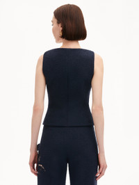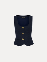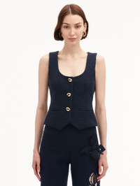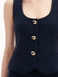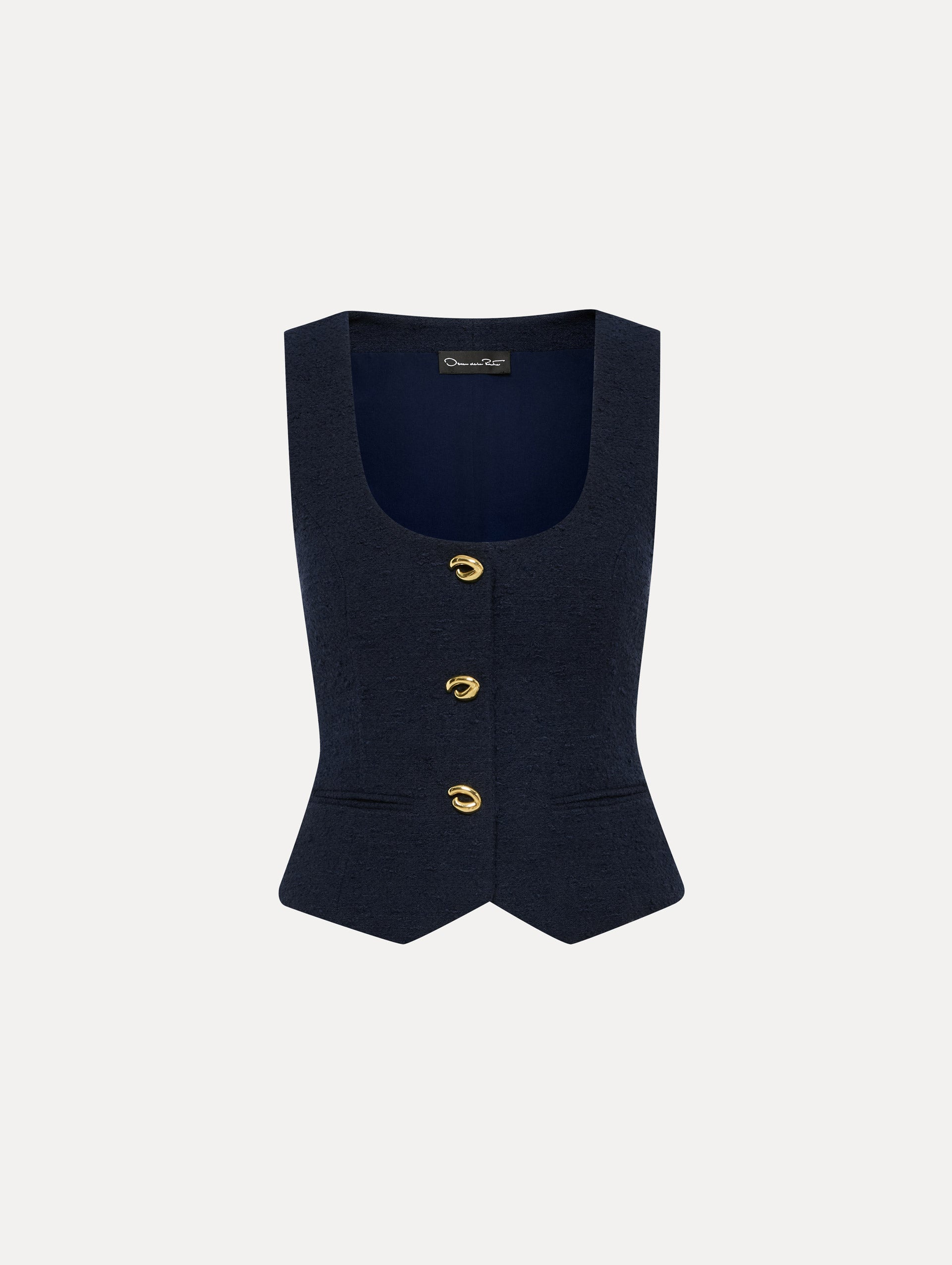 This cotton tweed vest, adorned with buttons in the shape of the iconic 'O' emblem, exudes brand heritage. Its refined design pairs effortlessly with denim for a casual touch or with coordinating trousers for a polished look. Details - Sleeveless - Scoop Neckline - Snap Button Front - Gold-Tone Hardware - Non-Functional Front Welt Pockets - Hip Length - 100% Silk Lining - Style Code: 25RN729CWD_NAV Materials & Care - 64% Cotton, 27% Virgin Wool, 9% Polyamide; Lining: 100% Silk