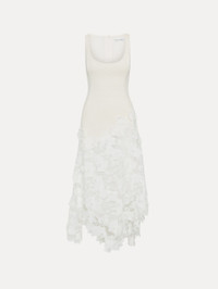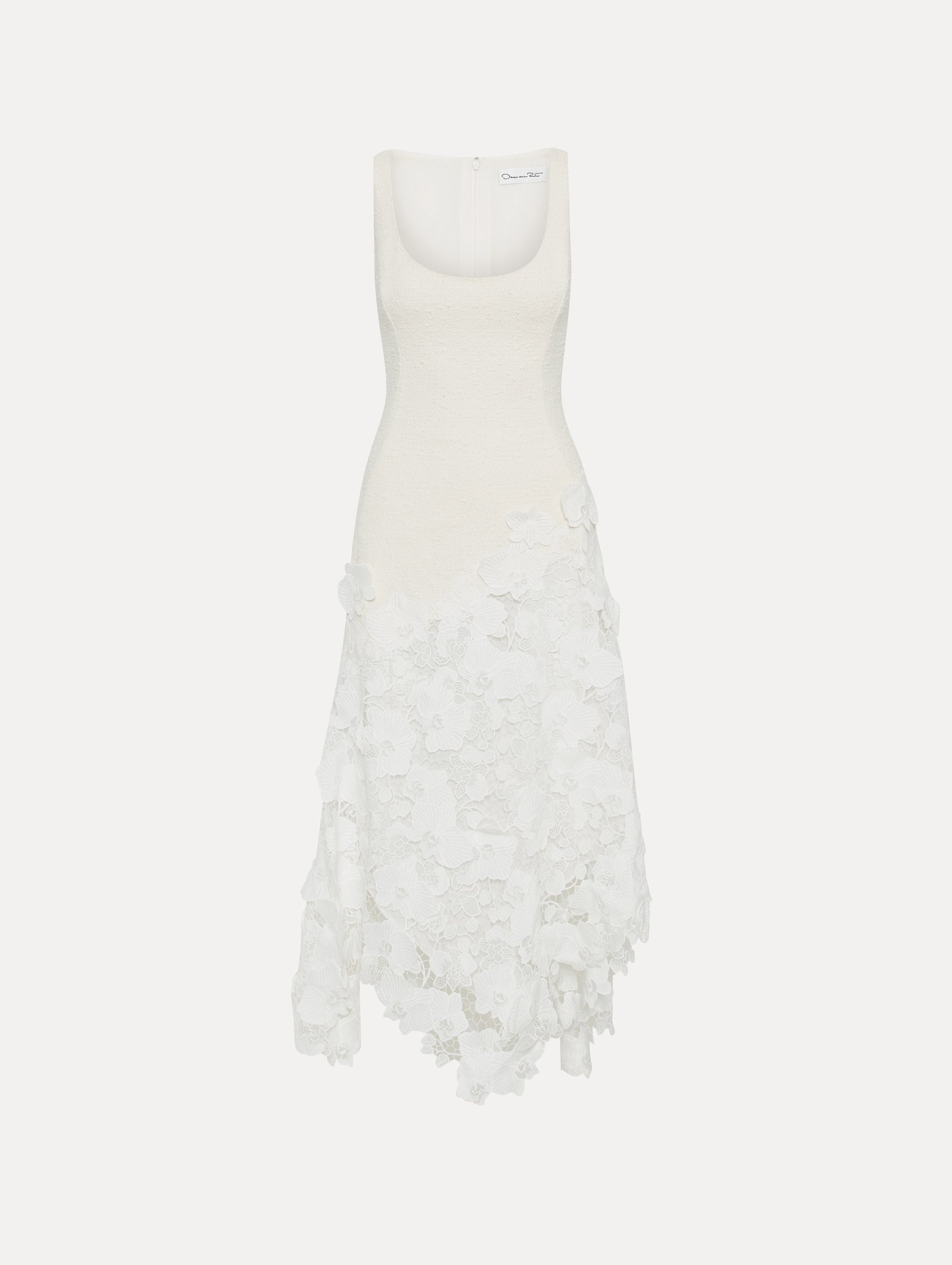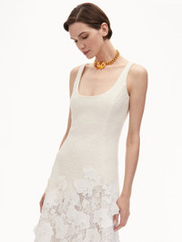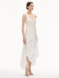 An undeniable favorite, this midi dress is an exploration of mixed-media splendor. Defined by an orchid guipure lace skirt, this dress parades a scoop neckline and asymmetrical hem. Details - Sleeveless - Square Neckline - Below the Knee Length - Asymmetrical Hemline - Concealed Back Zipper - Lined - Style Code: 25RN237CWD_IVR Materials & Care - 64% Cotton, 27% Virgin Wool, 9% Polyamide; Combo: 100% Polyester; Lining: 100% Silk