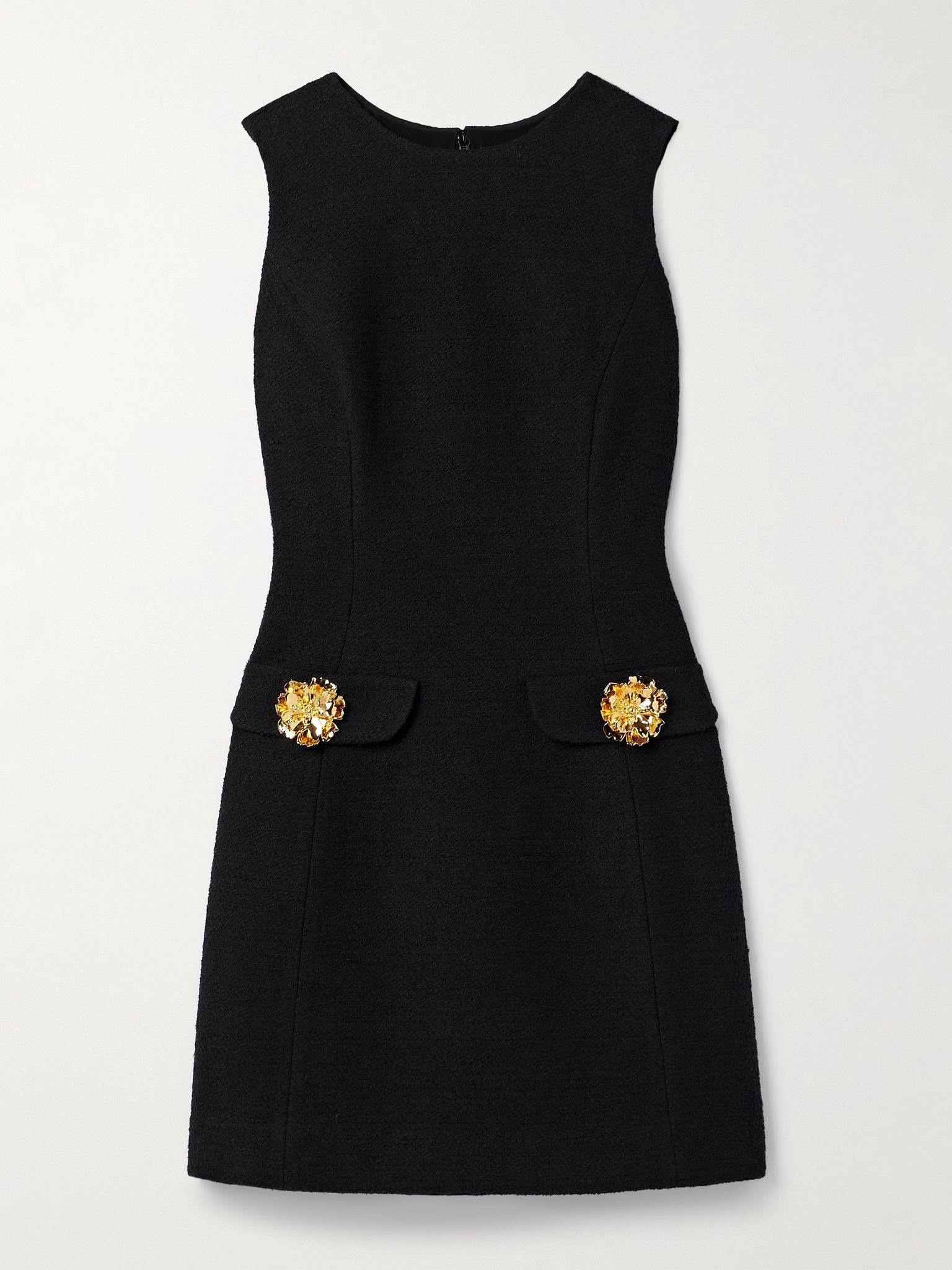 The tree peony is the key motif in Oscar de la Renta's Fall '25 collection. Debuted on the runway, this mini dress showcases the flower as gold-tone embellishments on the flap pockets. It's been made in Italy from cotton-blend tweed and has shaping darts through the body. Size & Fit - Fits true to size, take your normal size - Designed to be fitted at the bust and waist, loose at the hip - Mid-weight, non-stretchy fabric - Model is 175cm/ 5'9" and is wearing a US 2 Details & Care - Black cotton-blend tweed - Concealed hook and zip fastening at back - 64% cotton, 27% virgin wool, 9% polyamide; lining: 100% silk - Dry clean