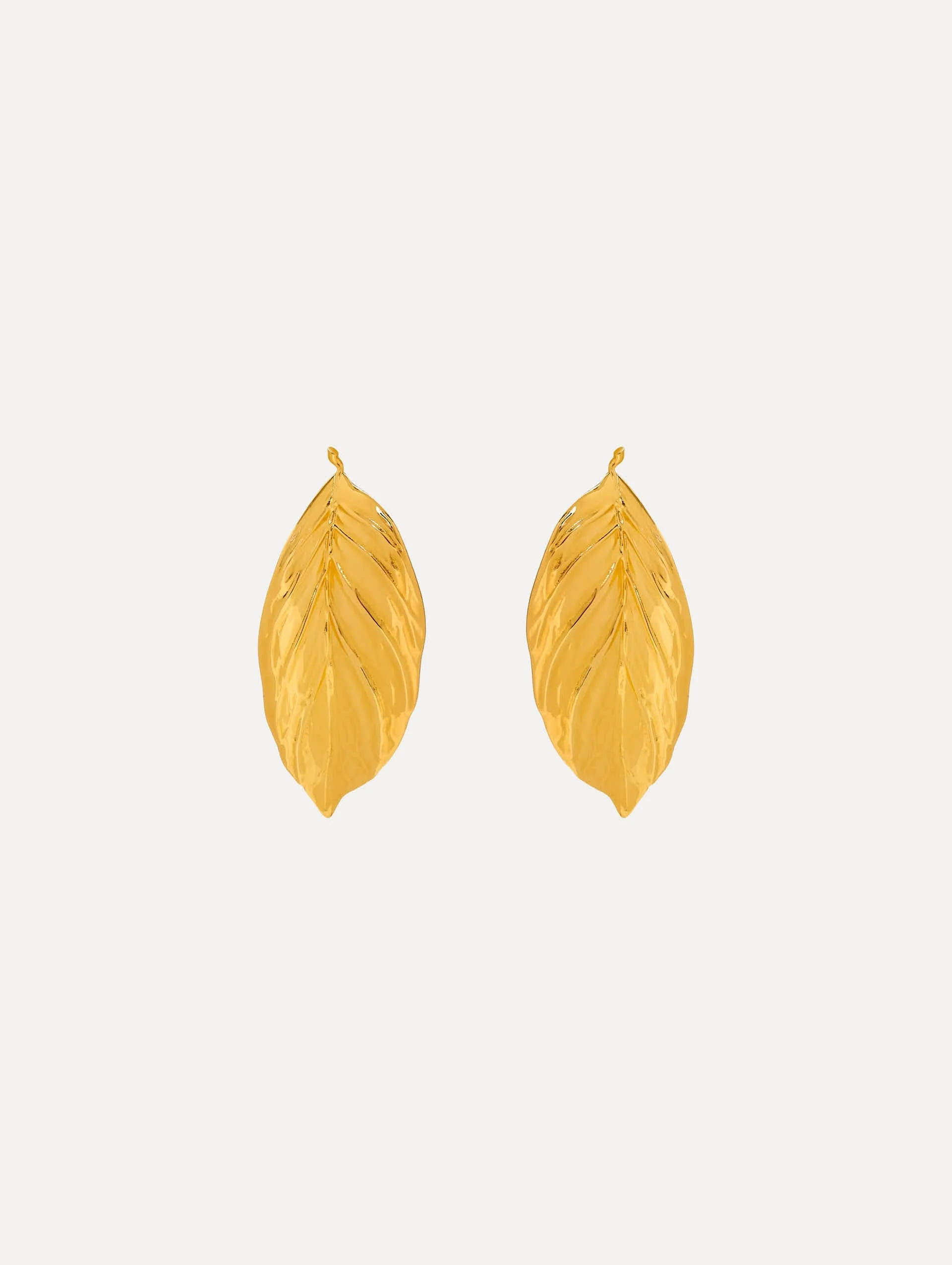 These gold leaf earrings capture the essence of nature's elegance. Sculpted with exquisite detail, each leaf showcases subtle textures, highlighting nature's beauty in its purest form. Details - Dimensions: 30 mm x 13 mm - Weight: 5 grams - Post Backs - For Pierced Ears - Style Code: P25J924_GOL - Country of Origin: Italy Materials & Care - 100% Brass