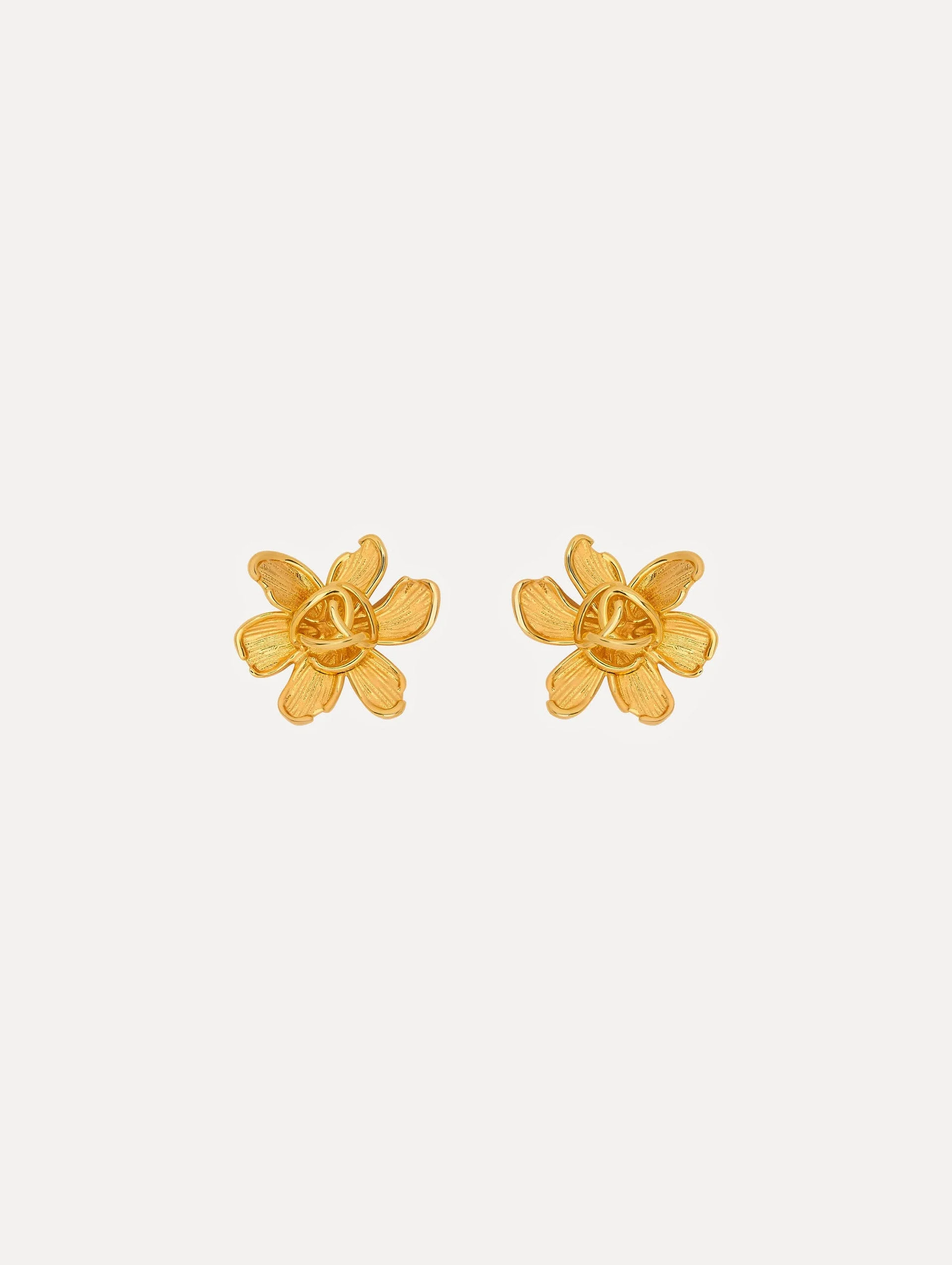 These textured floral earrings hold a subtle surprise, with sculpted petals that echo the curves of the Oscar 'O' and a braided emblem at the center drawn from this season’s signature motif. Details - Dimensions: 23 mm x 25 mm - Weight: 8 grams - Post Backs / For Pierced Ears - Style Code: F25J9362_GOL - Country of Origin: Italy Materials & Care - - 100% Brass - - Avoid exposing your jewelry to harsh chemicals. - - Lotions, cosmetics, hairspray and perfumes can cause chemical reactions that can cause the finish to deteriorate. - - Before handling, washing hands after applying makeup and hair products will help to preserve the finish. - - Do not wear in the pool, on the beach or in the shower. - - Wipe away dirt and body oils with a slightly damp microfiber jewelry cloth or cotton ball and allow to dry. - - Store separately in cloth pouches or small boxes to minimize scratching.