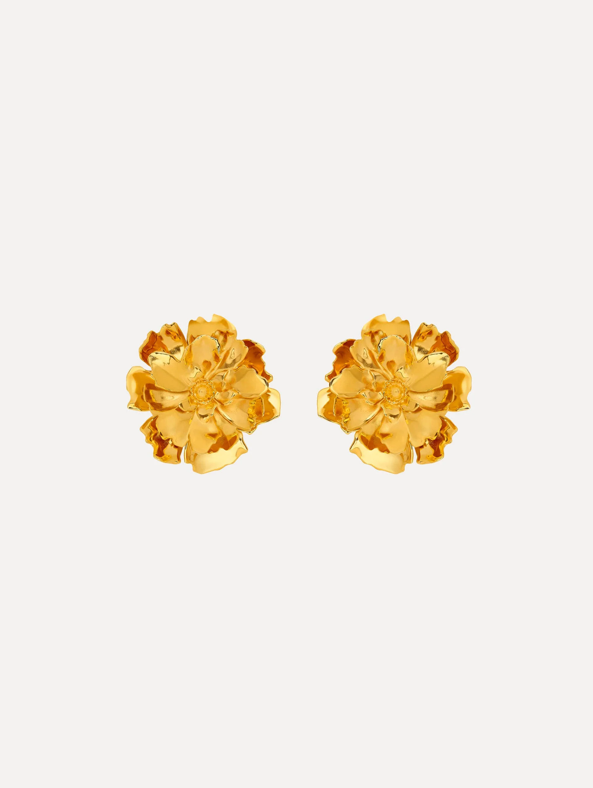 These gilt peony earrings capture the elegance of nature in its purest form. Sculpted with intricate detailing, the delicate blossoms exude a refined grace. Details - Dimensions: 32 mm x 35 mm - Weight: 26 grams - Clip Backs with Comfort Pads - Style Code: F25J934_GOL - Country of Origin: Italy Materials & Care - - 100% Brass - - Avoid exposing your jewelry to harsh chemicals. - - Lotions, cosmetics, hairspray and perfumes can cause chemical reactions that can cause the finish to deteriorate. - - Before handling, washing hands after applying makeup and hair products will help to preserve the finish. - - Do not wear in the pool, on the beach or in the shower. - - Wipe away dirt and body oils with a slightly damp microfiber jewelry cloth or cotton ball and allow to dry. - - Store separately in cloth pouches or small boxes to minimize scratching.