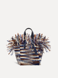 Hand-crocheted from vibrant raffia, this petite square tote is defined by its striking multi-colored pattern and playful fringe detailing. Each bag requires 24 hours of meticulous weaving, showcasing the artistry and precision behind its creation. Crafted by women artisans, this tote is part of a broader vision to empower and uplift. Through training in handwork, crochet and weaving, these women gain opportunities to support their families, access healthcare and invest in their children’s education. A creation with purpose, it reflects a vision of empowerment and a commitment to a brighter future. Details - Dimensions: 18 cm x 20 cm x 18 cm - Weight: 350 grams - Top Handle Drop Length 15 cm - Top Handle - Open Top - Dog Clip Closure - Unlined - Style Code: 25SH125RAF_NNU - Country of Origin: Italy Materials & Care - 95% Raffia, 5% Calf Leather