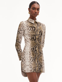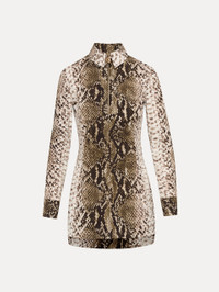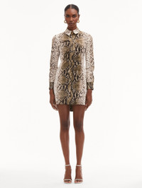 A snakeskin concept is presented for Pre-Spring 2025 on this shirt dress. This timeless design features a shirt collar and zip front, adding a bold touch to a classic style. Details - Long Sleeves with Button Cuffs - Shirt Collar with Zip Front - Gold-Tone Hardware - Shirt Tail Hemline - Mid-Thigh Length - Pullover Style - Unlined - Style Code: 25RN217SNN_OLI Materials & Care - 97% Cotton, 3% Elastane