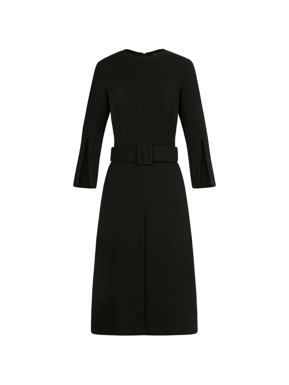 split-sleeve wool-blend dress Highlights - Tailored with clean lines and a softly structured drape, this belted dress balances modern ease with refined polish. a sculptural crew neckline and slit cape sleeves create graceful movement, while a coordinating buckle belt defines the waist with quiet precision. - Three-quarter-length sleeves - Jewel neckline - Coordinating buckle bet - Concealed back zipper Made in Italy Composition Virgin Wool 95%, Polyester 4%, Elastane 1% Washing instructions Dry Clean Only