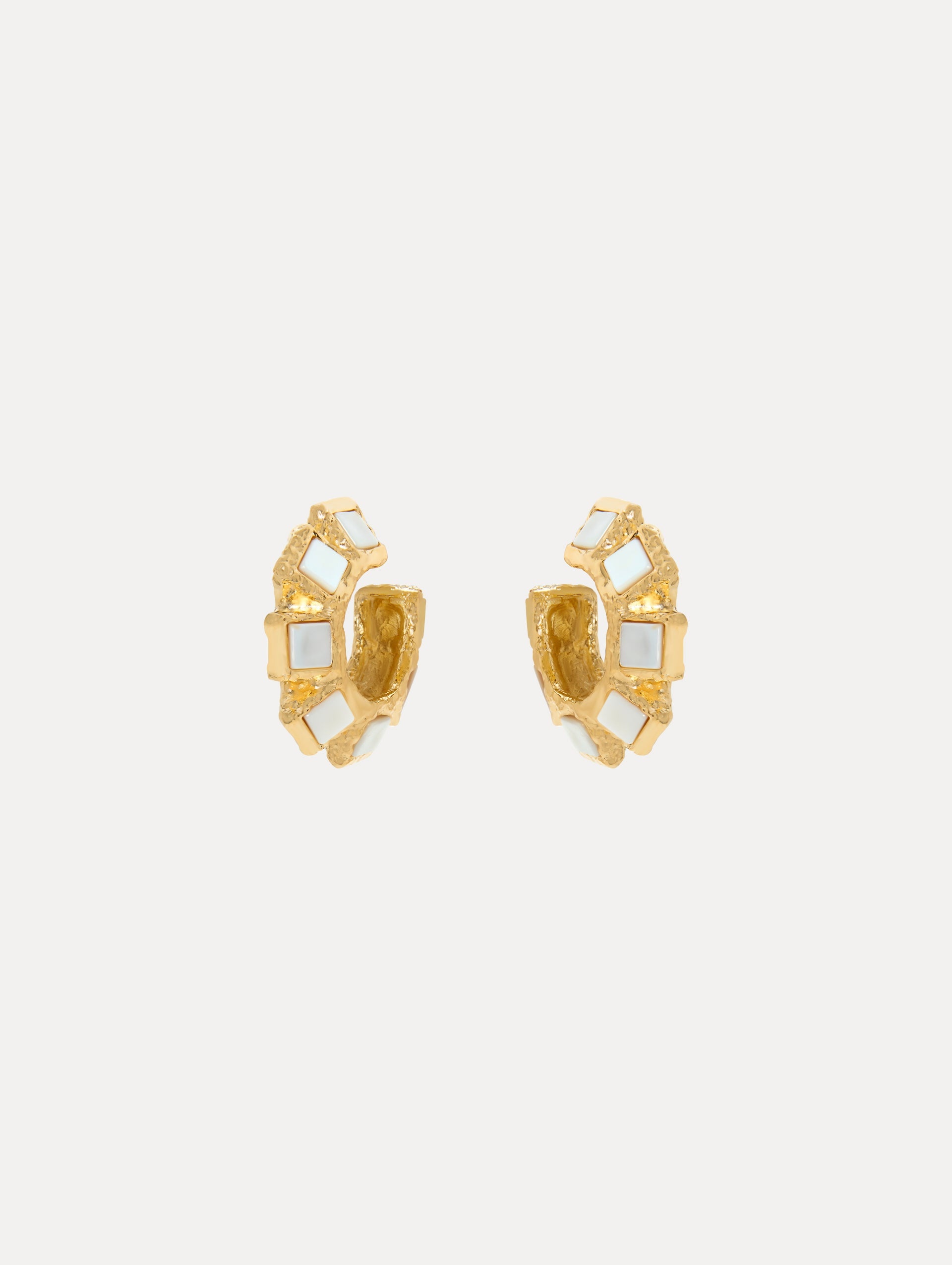 These hoop earrings feature square semi-precious stones set in gold-tone hardware, creating a dimensional hoop silhouette. The texture of the setting adds a touch of organic elegance, contrasting the polished stones. Details - Dimensions: 1.5 x 0.5" - Weight: 21 Grams - Post Backs - For Pierced Ears - Semi-Precious Stone from China - Style Code: R25J103_WMP Materials & Care - 77% Pewter, 15% Semi-Precious Stone, 3% Steel, 4% Brass, 1% Gold