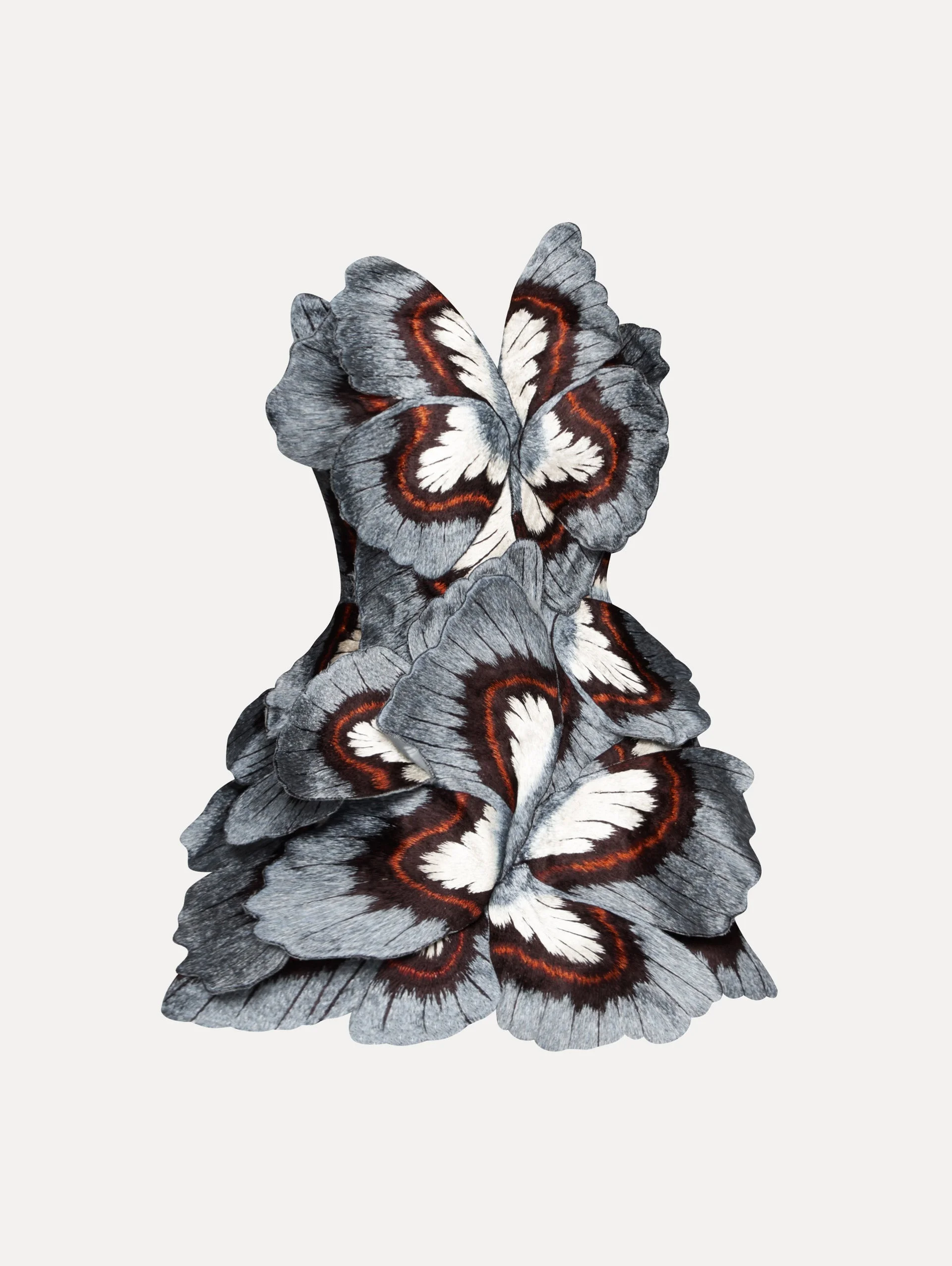 A breathtaking display of artistry, this cocktail dress is adorned with three-dimensional threadwork butterflies, each intricately embroidered for a lifelike, fluttering effect. Details - Strapless - Cupcake Silhouette - Concealed Back Zipper - Internal Bustier with Petticoat - 100% Silk Lining - Style Code: 25PE687TUL_BMM - Country of Origin: USA Materials & Care - 100% Polyamide; Lining: 100% Silk