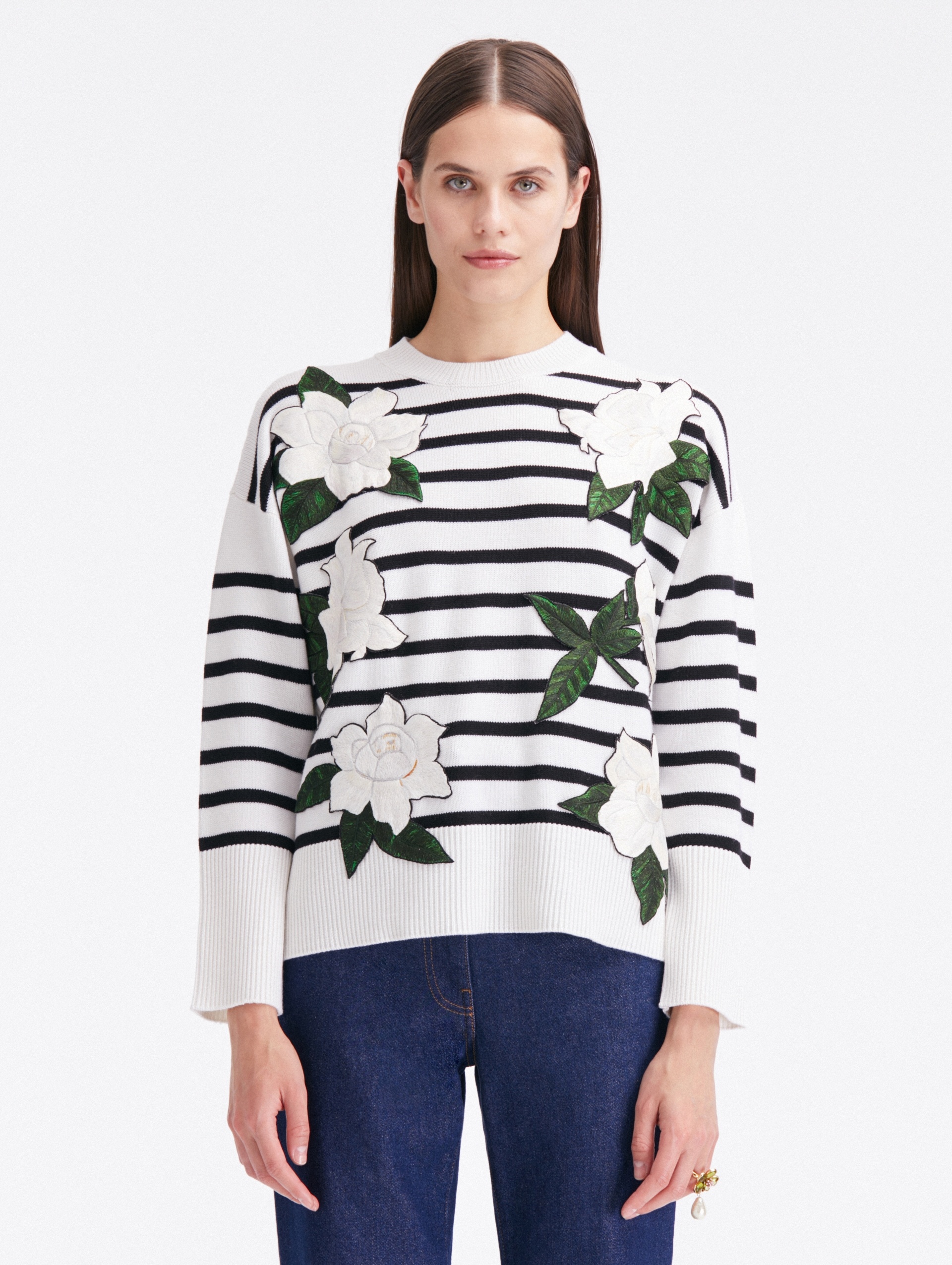 A STATEMENT PULLOVER IS THE PERFECT ADDITION TO ANY WARDROBE. DEFINED BY MULTICOLORED STRIPES AND GARDENIA THREADWORK EMBROIDERY, THIS SWEATER BOASTS A WIDE-RIBBED TRIM. LONG SLEEVES / CREW NECKLINE / PULLOVER STYLE / RELAXED SILHOUETTE / HIP-LENGTH / RIBBED TRIM / DRY CLEAN DIMENSIONS: MODEL IS 5'10" / 180 CM AND WEARING SIZE S MATERIAL: 97% VIRGIN WOOL, 2% POLYAMIDE, 1% ELASTANE MADE IN ITALY STYLE 24RE124SEM_WHB