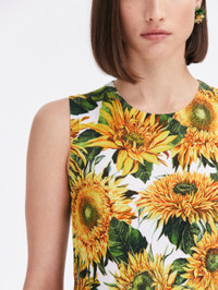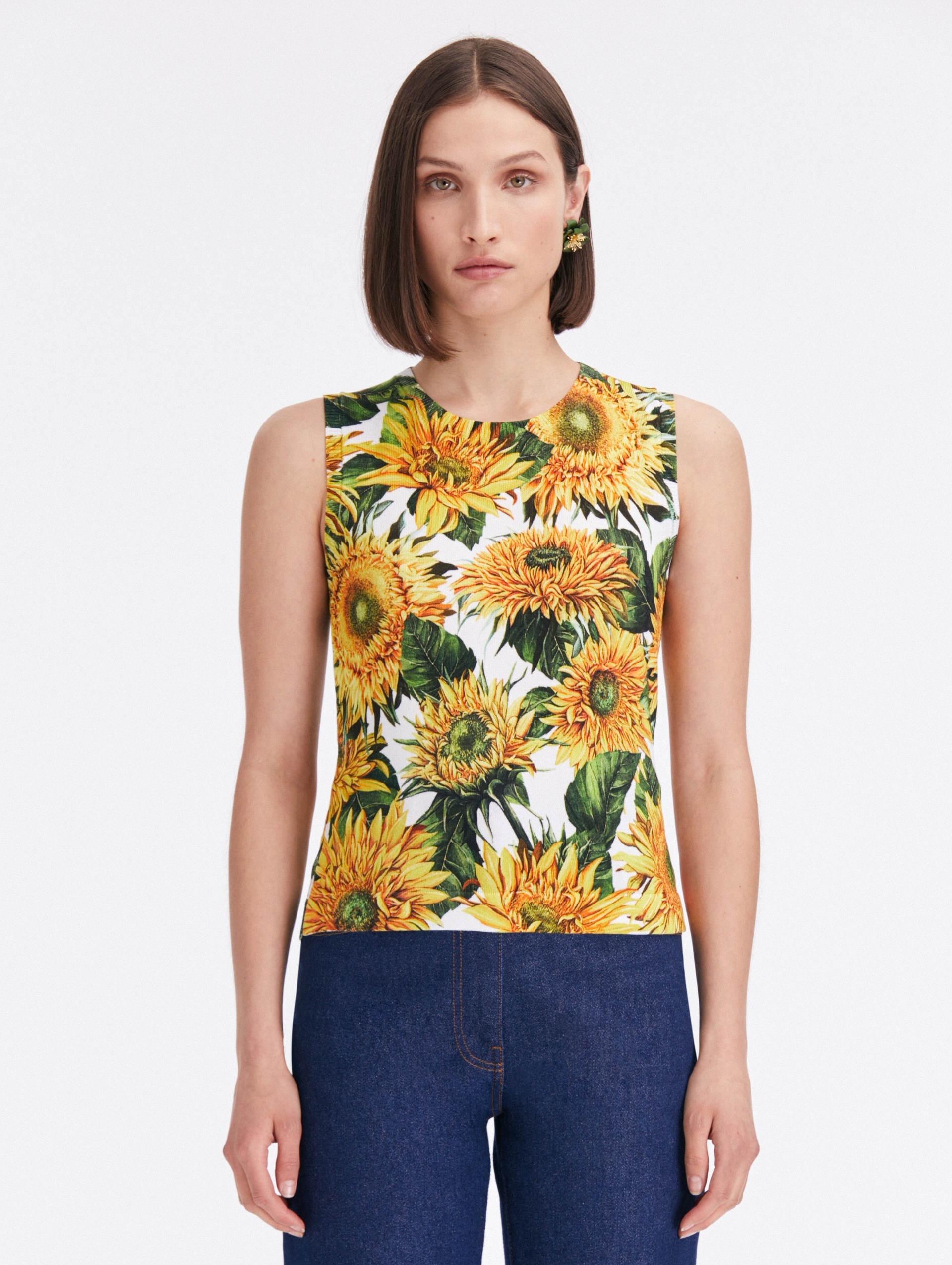 THIS CLASSIC RIBBED-KNIT TANK IS DEFINED BY THE SUNFLOWER PRINT, A PILLAR OF THE PRE-SPRING 2024 COLLECTION. CUT IN A FORM-FITTING SILHOUETTE, THIS STYLE FEATURES A CREW NECKLINE AND BANDED TRIM. WEAR ALONE FOR A SLEEVELESS STATEMENT OR PAIR WITH ITS COORDINATING CARDIGAN FOR OPTIMAL VERSATILITY. SLEEVELESS / CREW NECKLINE / SLIM FIT / HIP LENGTH / PULLOVER STYLE / RIBBED TRIM / UNLINED / DRY CLEAN DIMENSIONS: MODEL IS 5'10.5" / 180 CM AND WEARING SIZE 2 MATERIAL: 57% COTTON, 43% VISCOSE MADE IN ITALY STYLE 24RN126SUN_YSB