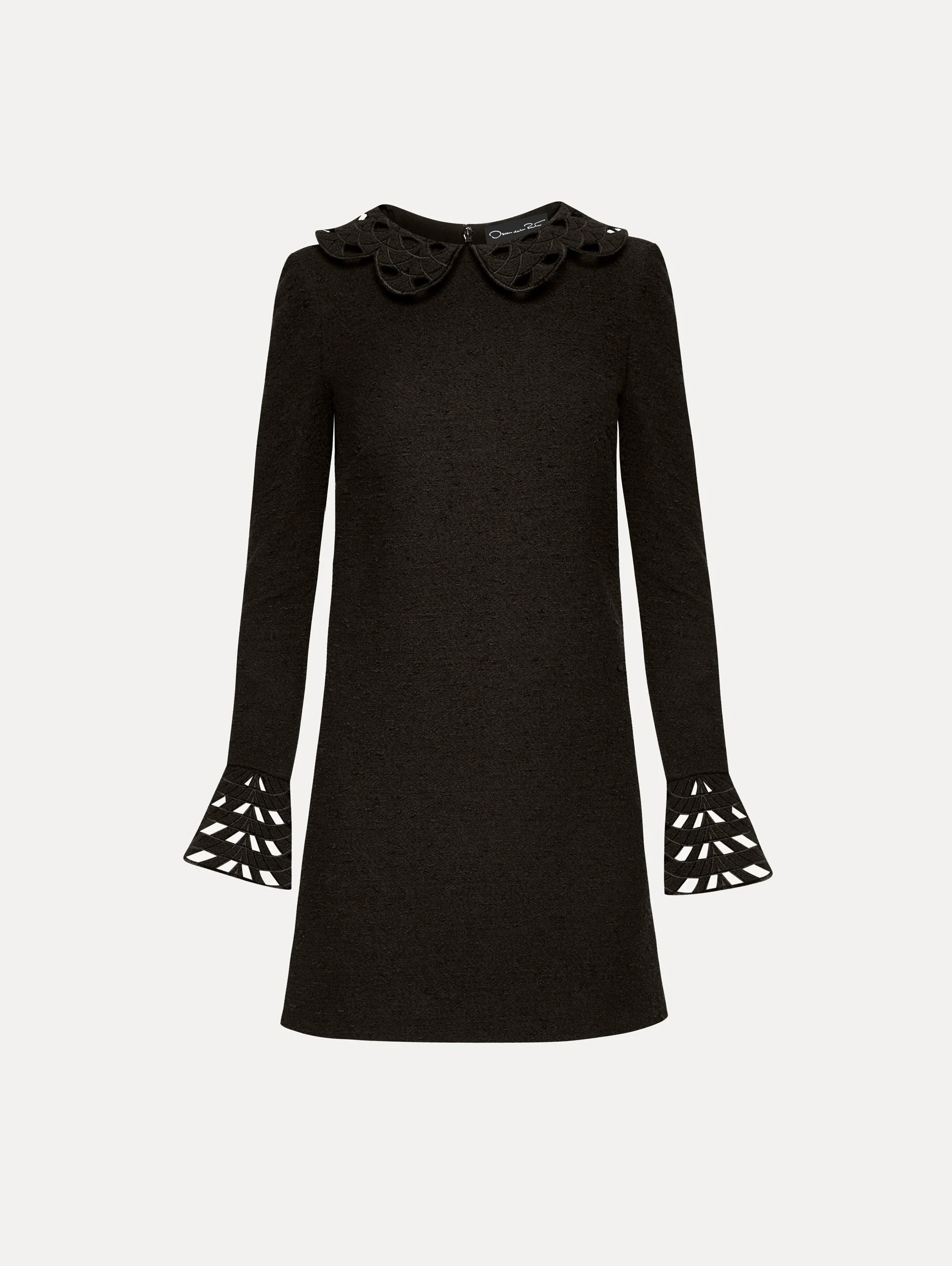 This black cotton-wool tweed shift dress is defined by delicate threadwork cutouts at the scalloped collar and cuffs, merging classic elegance with intricate detailing. Details - Long Sleeve - Spread Collar - Shift Silhouette - Concealed Back Zipper - Lined - Style Code: 25PE244CWD_BAK - Country of Origin: Italy Materials & Care - 64% Cotton, 27% Wool, 9% Polyamide