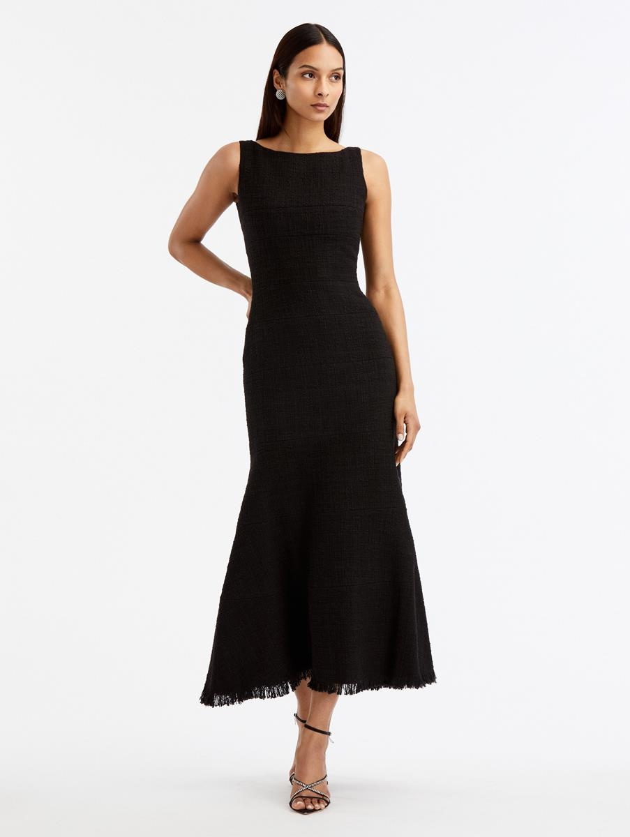 THIS TEA LENGTH DRESS, CUT FROM TEXTURED TWEED, CAPTURES EFFORTLESS ELEGANCE WITH EASE. WITH A BATEAU NECKLINE AND FRINGED HEM, THIS PIECE IS SURE TO BE A GO-TO FAVORITE FOR YEARS TO COME. SLEEVELESS / BATEAU NECKLINE / FLUTED SILHOUETTE / TEA LENGTH / SIDE ZIP / DRY CLEAN DIMENSIONS: MODEL IS 5'10.5" / 180 CM AND WEARING SIZE 2 MATERIAL: 90% COTTON, 10% VISCOSE MADE IN USA STYLE 23CN260SLW_BLK