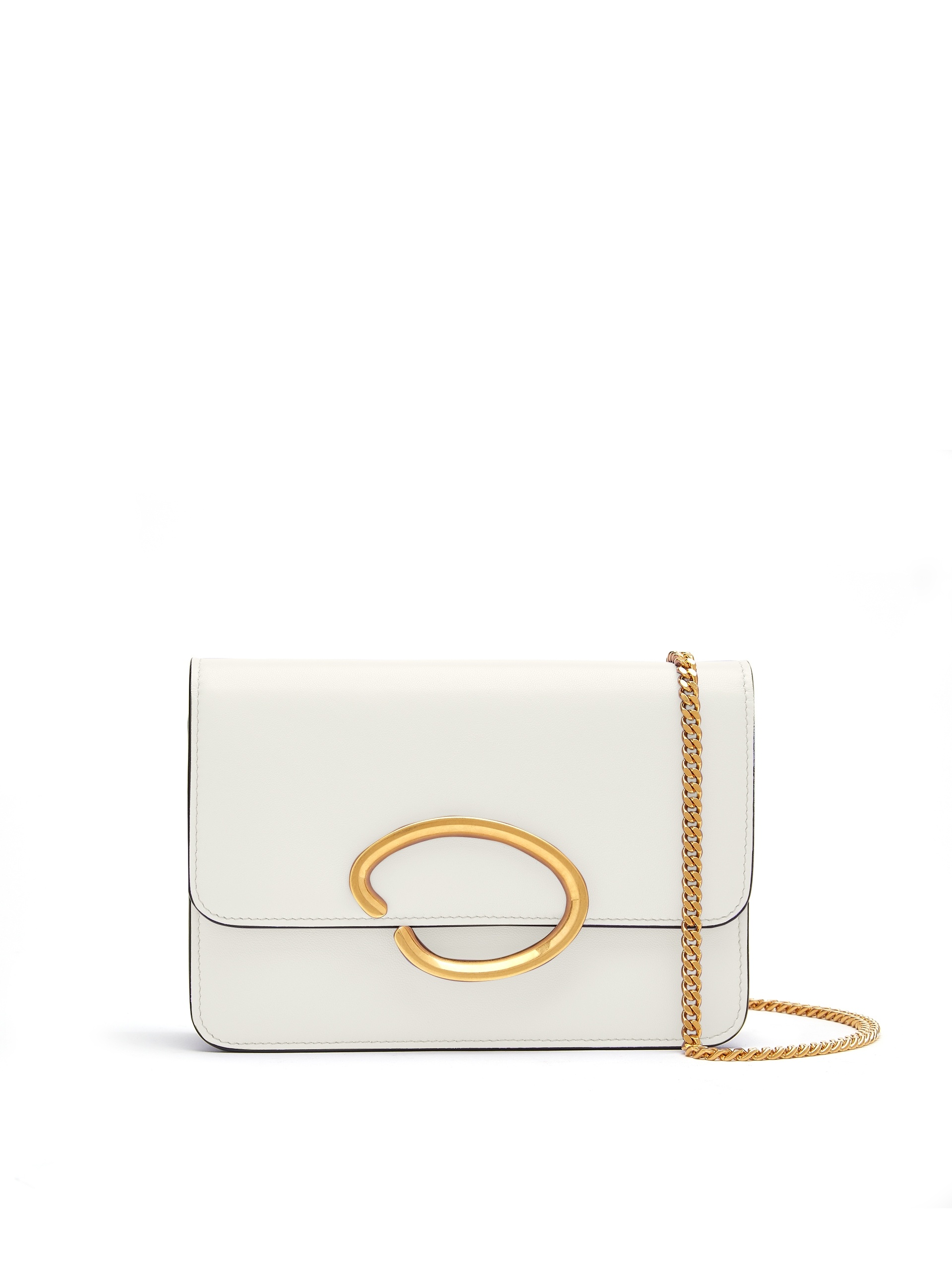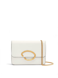 AN EVERYDAY ESSENTIAL, THIS CLASSIC STYLE IS CRAFTED FROM WHITE NAPPA LEATHER WITH OSCAR'S SIGNATURE GLOSSY GOLD O AT THE CLASP AND A DETACHABLE CHAIN SHOULDER STRAP. DIMENSIONS: DIMENSIONS: 18.2 CM X 13.1 CM X 4.3 CM MATERIAL: 100% LEATHER MADE IN ITALY STYLE 23SH561NLT_WHT