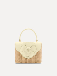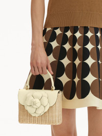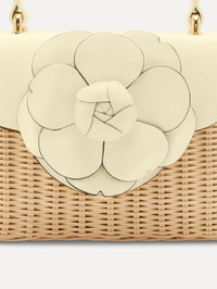 Crafted from hand-woven wicker for a breezy, summery feel, this compact handbag is finished with smooth calfskin details and a sculptural gardenia moulded-leather applique for an artful touch. With its structured top handle and optional chain-link shoulder strap, it transitions effortlessly from day to evening. Details - Dimensions: 17 cm x 13.5 cm x 8 cm - Weight: 580 grams - Short Strap: Top Handle Drop Length 8 cm - Long Strap: Chain Length 120 cm - Drop Length 57.1 cm - Top Handle - Interior Pocket - Push-Lock Closure - Detachable Chain Shoulder Strap - Unlined - Fits Up to an iPhone 16 Pro - Style Code: 25SH169WIC_BNN - Country of Origin: Italy Materials & Care - - 80% Wicker, 20% Calf Leather - - Remove dust regularly with a dry or slightly damp cloth and allow to dry completely. Avoid prolonged exposure to direct sunlight to prevent discoloration. - - Keep away from heat sources to maintain the bag’s structure and finish. - - Store in its original packaging in a cool, dry place, protected from light, heat, and humidity. - - For oil stains, gently wash with water and mild soap. If needed, test a degreasing agent on a hidden area before applying. - - For other stains, wipe with a slightly damp cloth and lukewarm water. If the stain persists, try using soapy water.