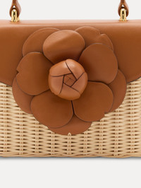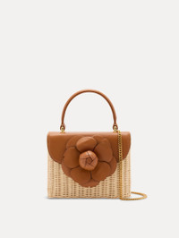 Crafted from hand-woven wicker for a breezy, summery feel, this compact handbag is finished with smooth calfskin details and a sculptural gardenia moulded-leather applique for an artful touch. With its structured top handle and optional chain-link shoulder strap, it transitions effortlessly from day to evening. Details - Dimensions: 17 cm x 13.5 cm x 8 cm - Weight: 580 grams - Short Strap: Top Handle Drop Length 8 cm - Long Strap: Chain Length 120 cm - Drop Length 57.1 cm - Top Handle - Interior Pocket - Push-Lock Closure - Detachable Chain Shoulder Strap - Unlined - Fits Up to an iPhone 14 Pro - Style Code: 25SH169WIC_COG - Country of Origin: Italy Materials & Care - 80% Wicker, 20% Calf Leather