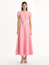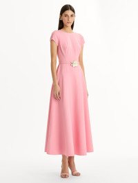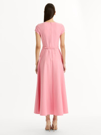 This short-sleeve wool dress is cleanly tailored with a fitted bodice and flared skirt. A slim belt with a dimensional floral detail defines the waist, adding a refined accent to the streamlined silhouette. Details - Short Sleeves - Jewel Neckline - Coordinating Novelty Belt - Concealed Back Zipper - Unlined - Country of Origin: Italy - Style Code: 26RN291DSW_PET Materials & Care - 94% Virgin Wool, 5% Elastane, 1% Polyamide - Dry clean only.