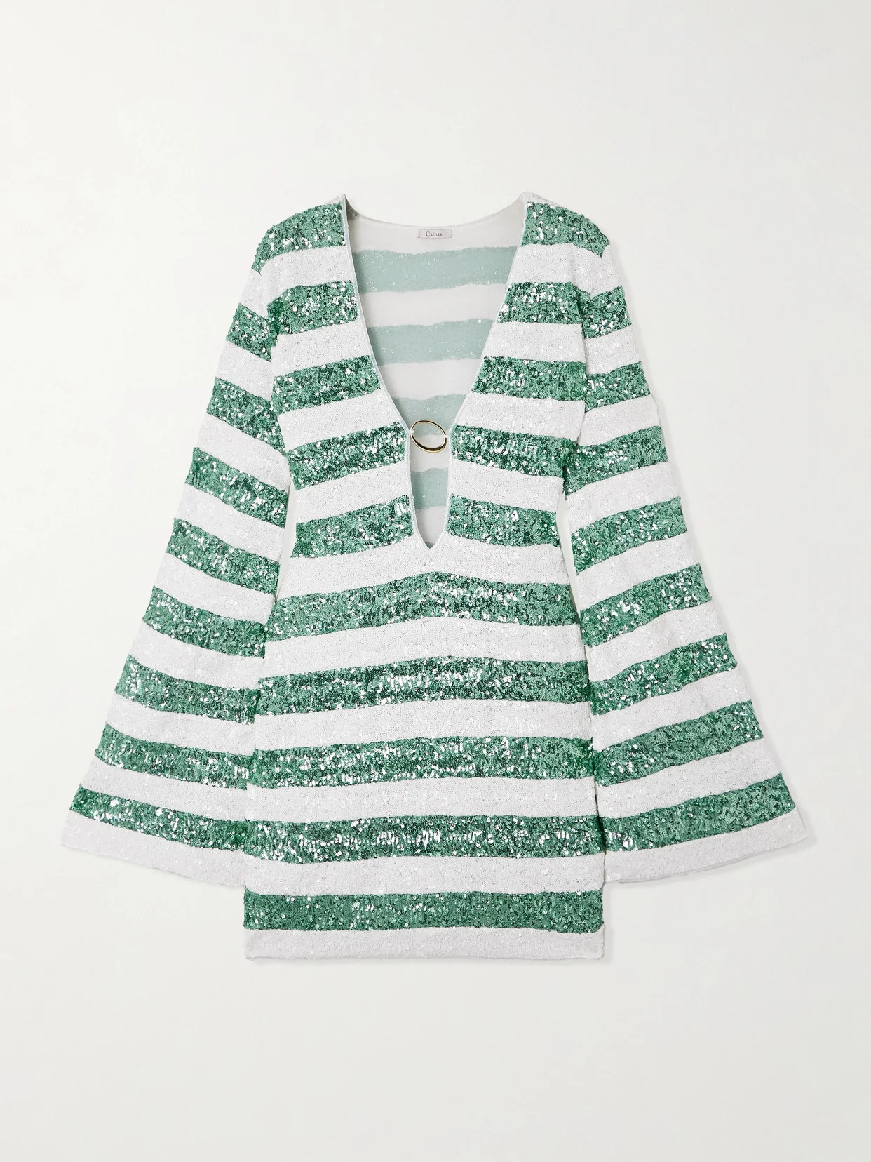 When it comes to glamorous beachwear, Oseree sets the standard. This kaftan is made from glittering, sequined mesh that's patterned with playful candy-inspired stripes and has a plunging neckline embellished with a gold-tone ring. Slip yours on over the label's swimwear.