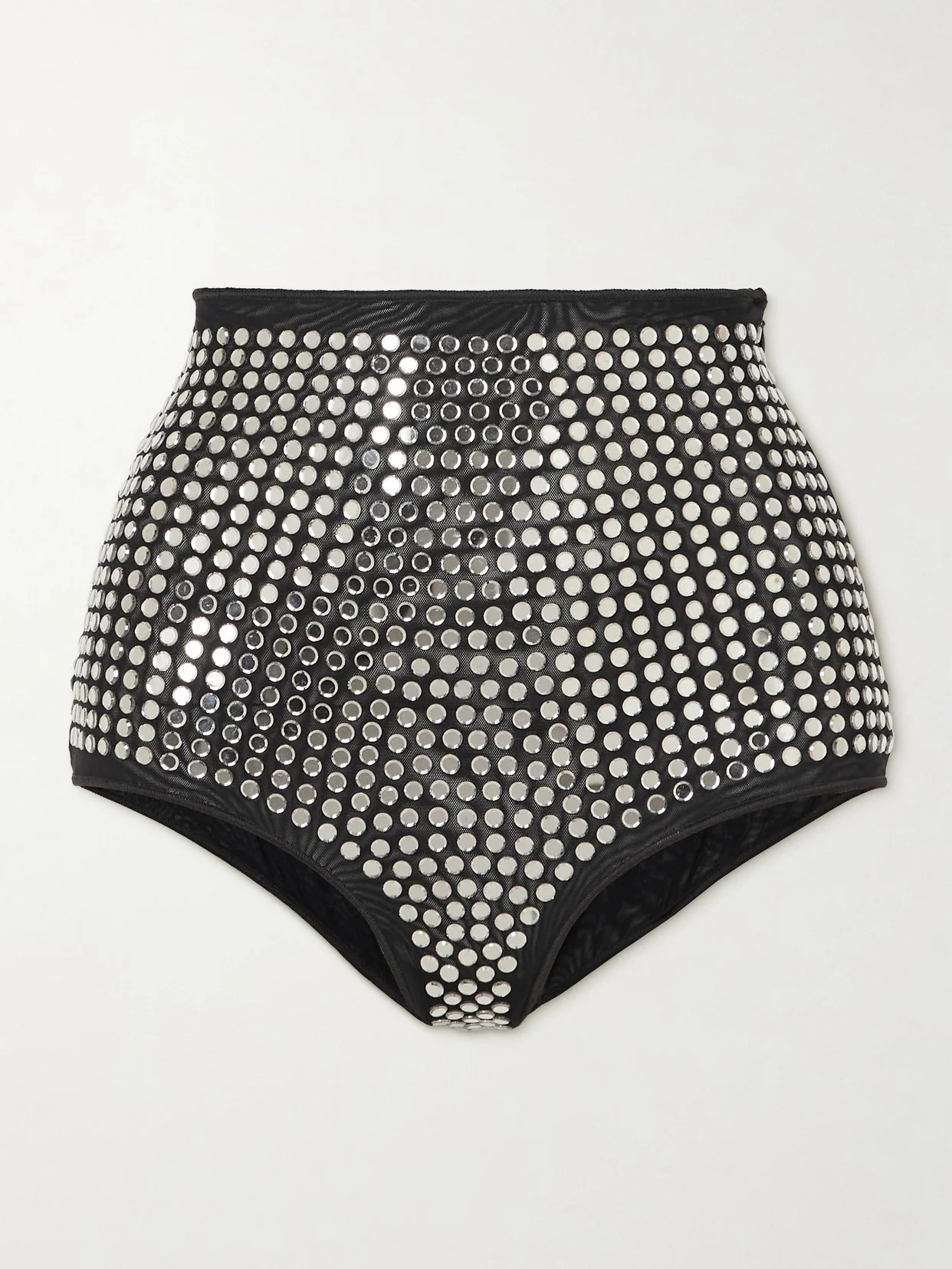 High-octane, glamorous details are Oseree's specialty. Made from stretch-tulle, these high-rise briefs are encrusted with rows of light-catching crystals. Wear yours with the matching bralette, or switch it up with a tonal black version.